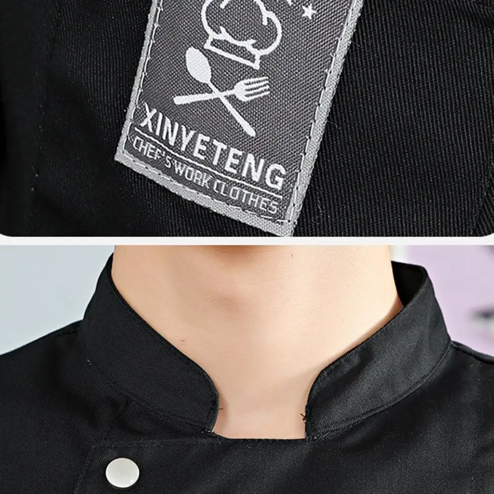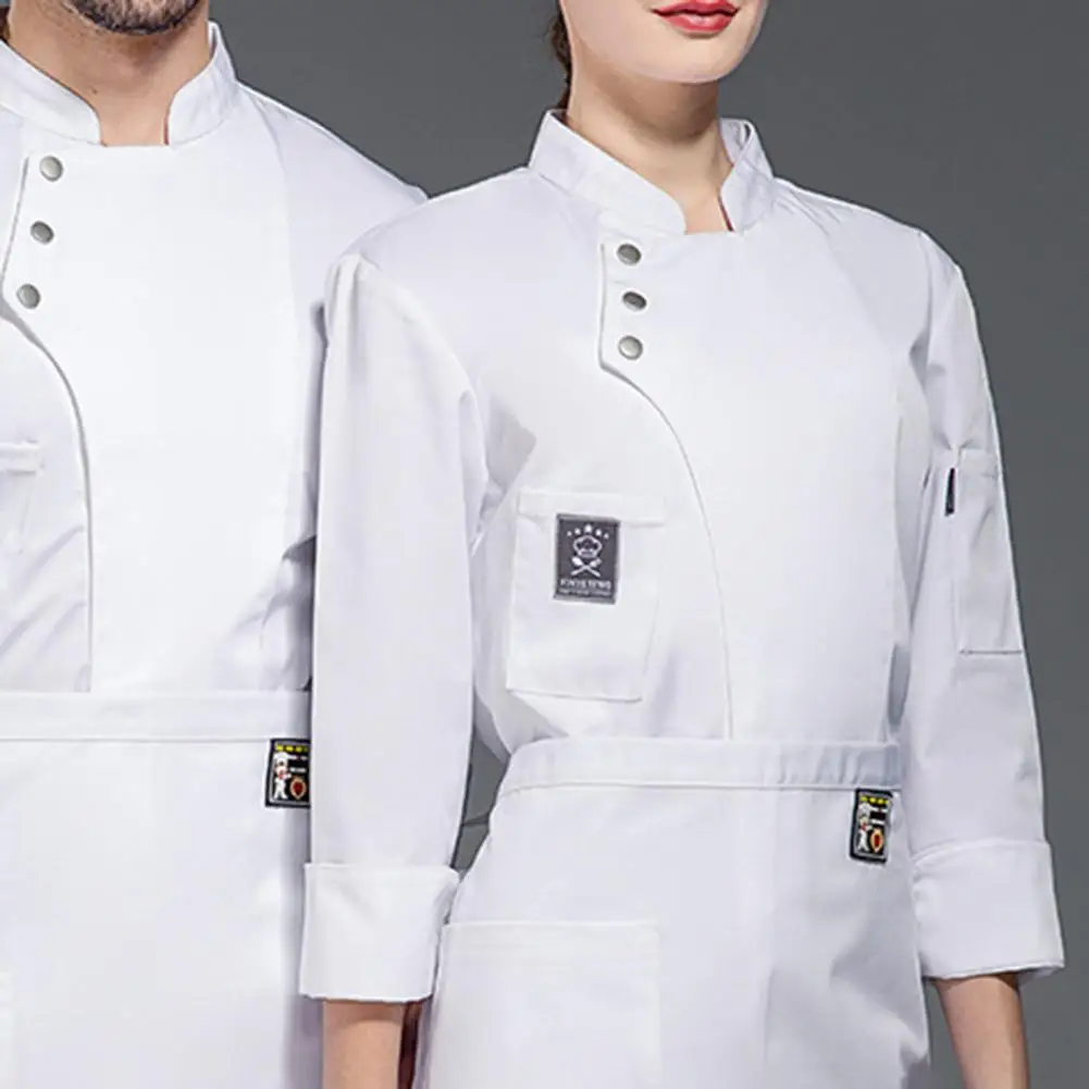 The chef's jacket is adorned with single-breasted buttons, a stand-up collar, and line modifications on the pockets, giving it a simple yet stylish appearance. It can be easily paired with an apron and a chef's hat for a more formal and professional look.