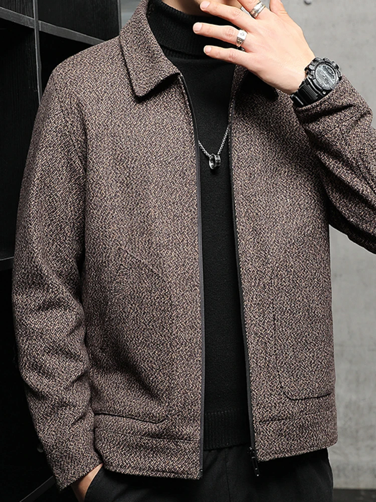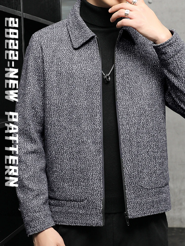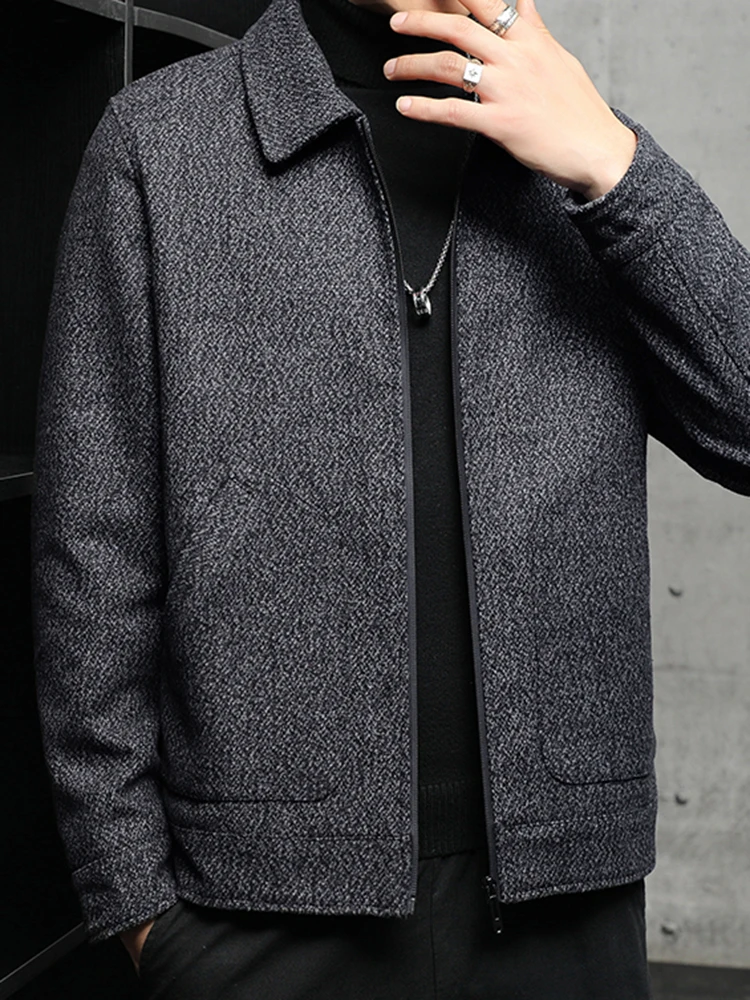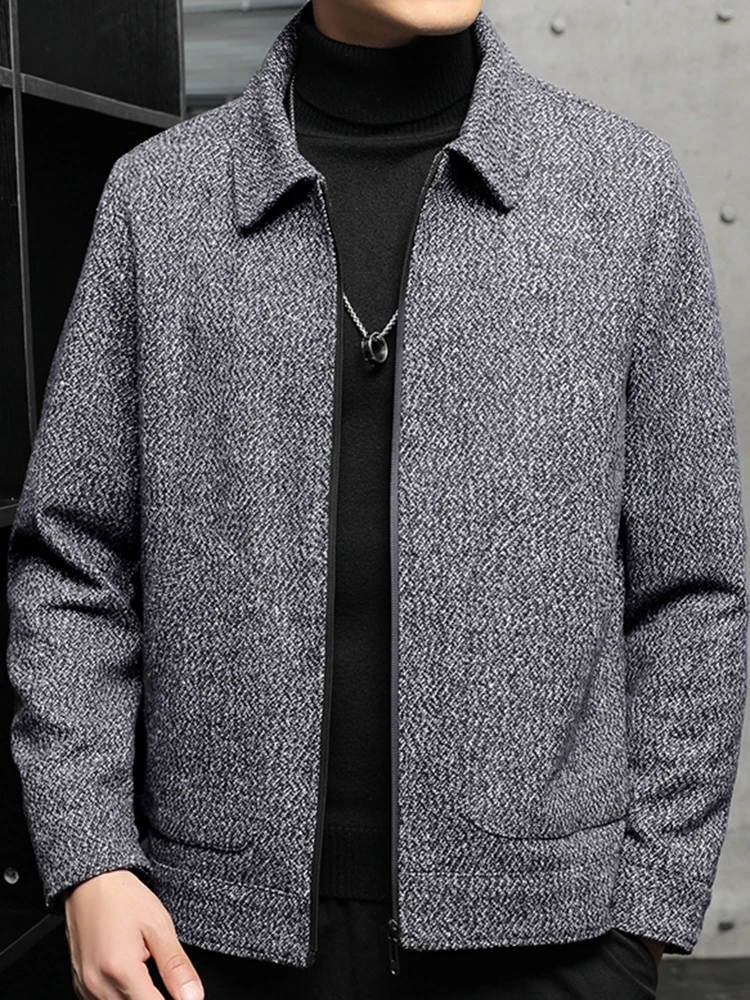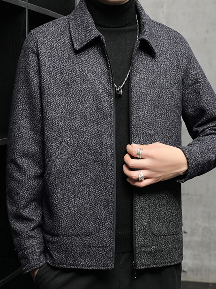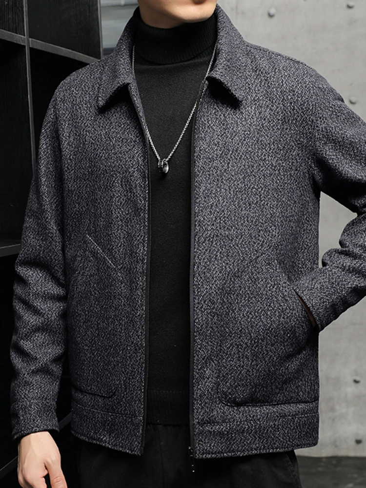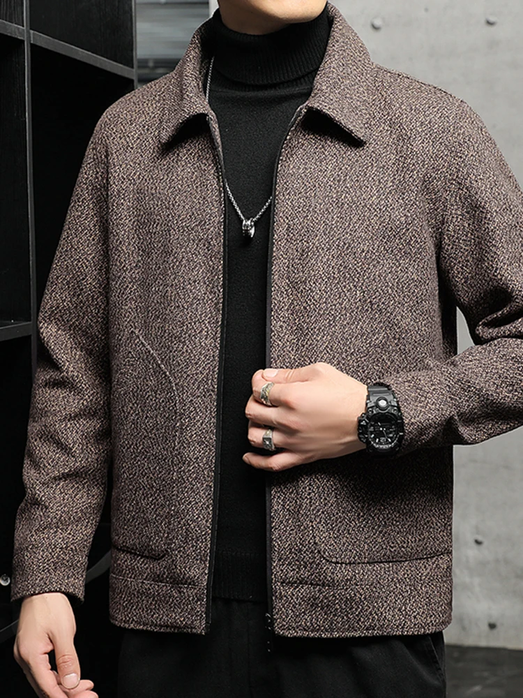Men’s New Tweed Coat Padded Thickened Winter Cold Flap Collar Zipper Solid Color Casual Trend Large Pockets Comfortable Jacket