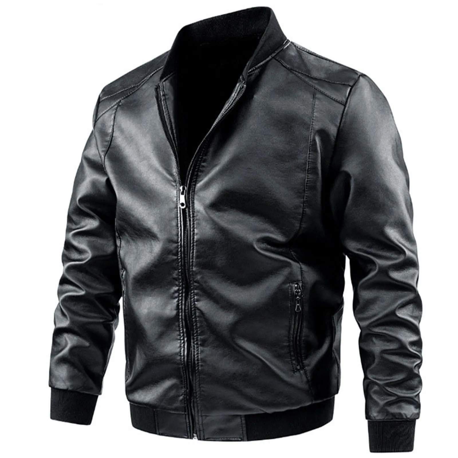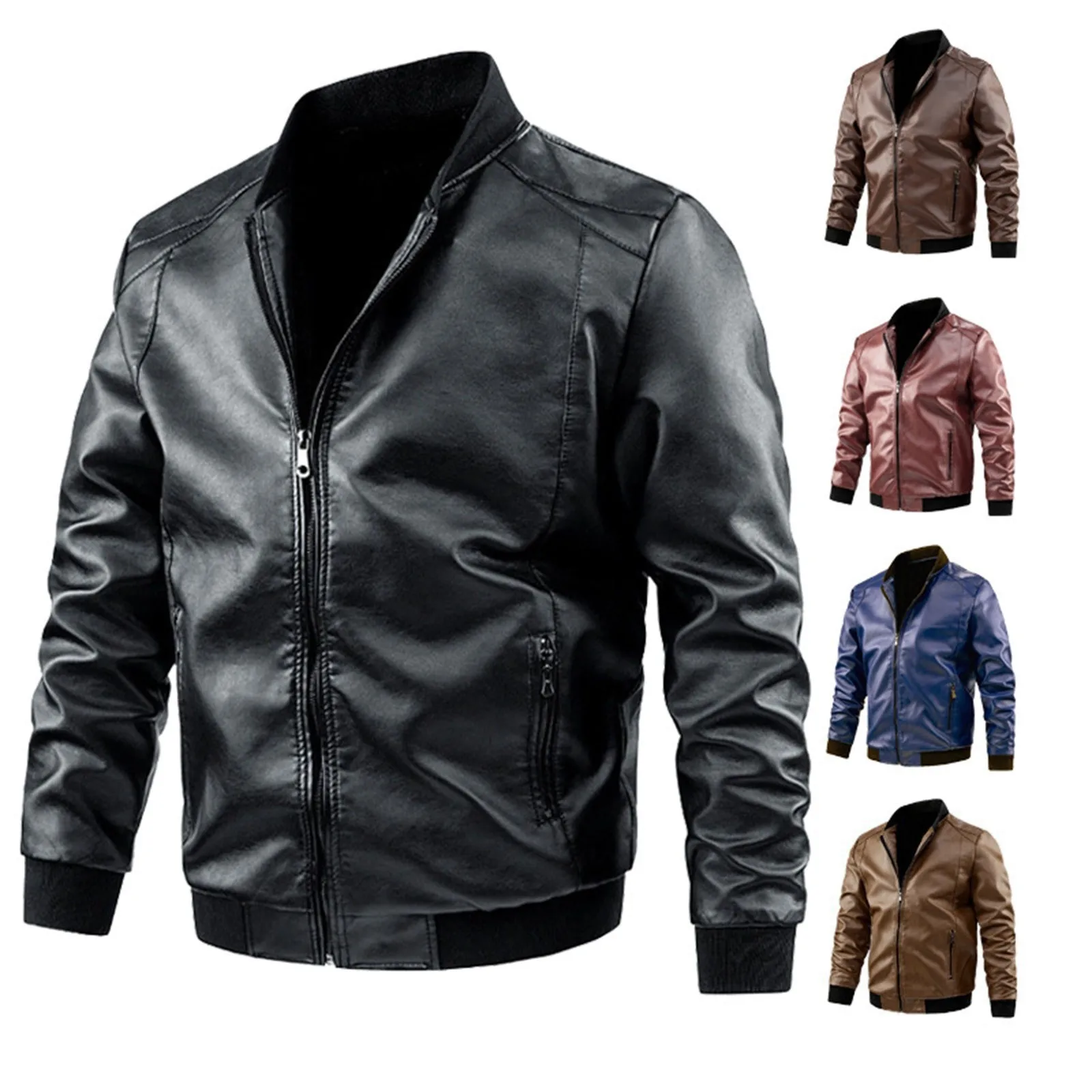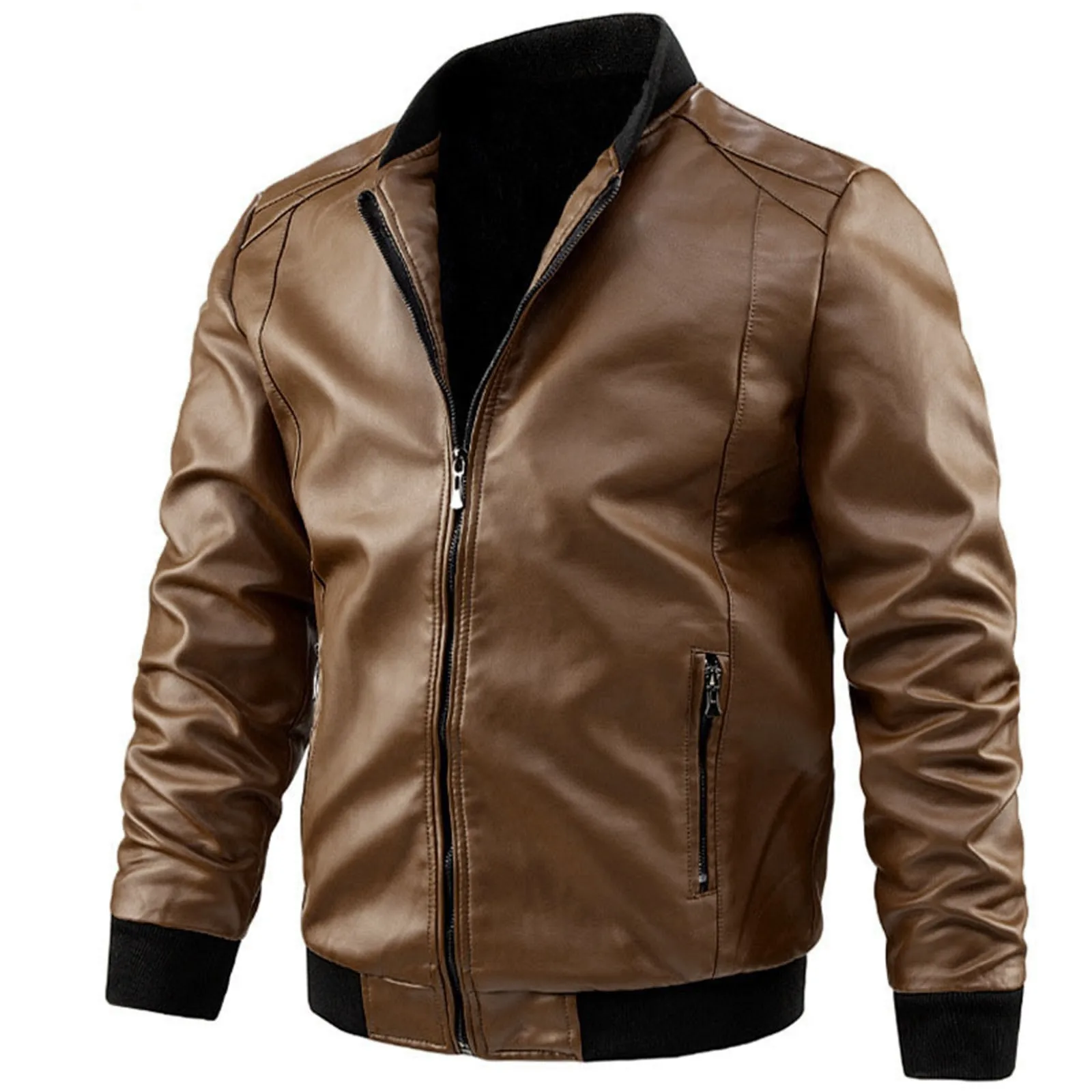 Male Autumn And Winter Casual Solid Color Leather Jacket Warm Coat Jacket Stand Collar Long Sleeve Pocket Coat