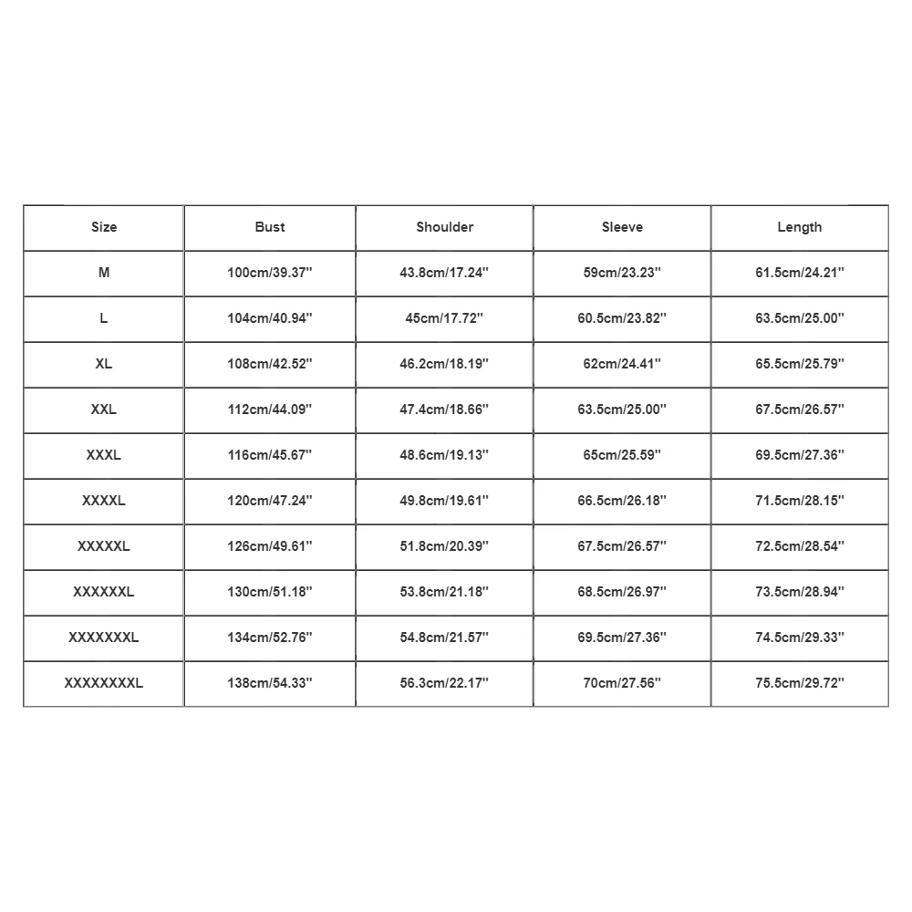 | Size:XXXXXXXXL | Bust:138cm/54.33” | Shoulder:56.3cm/22.17” | Sleeve:70cm/27.56” | Length:75.5cm/29.72” |