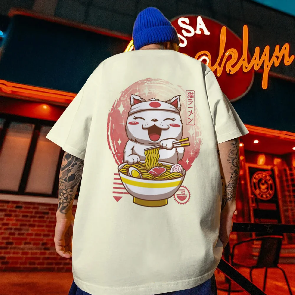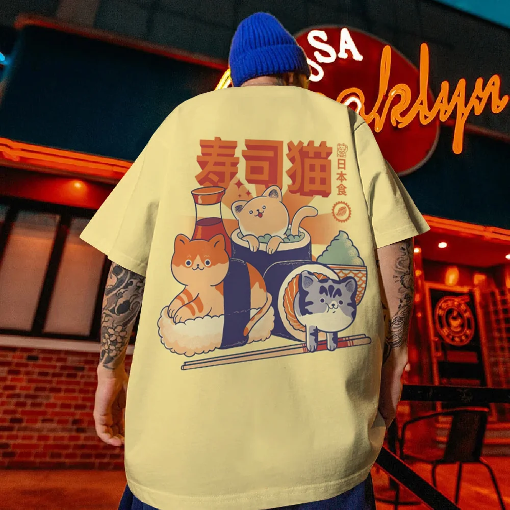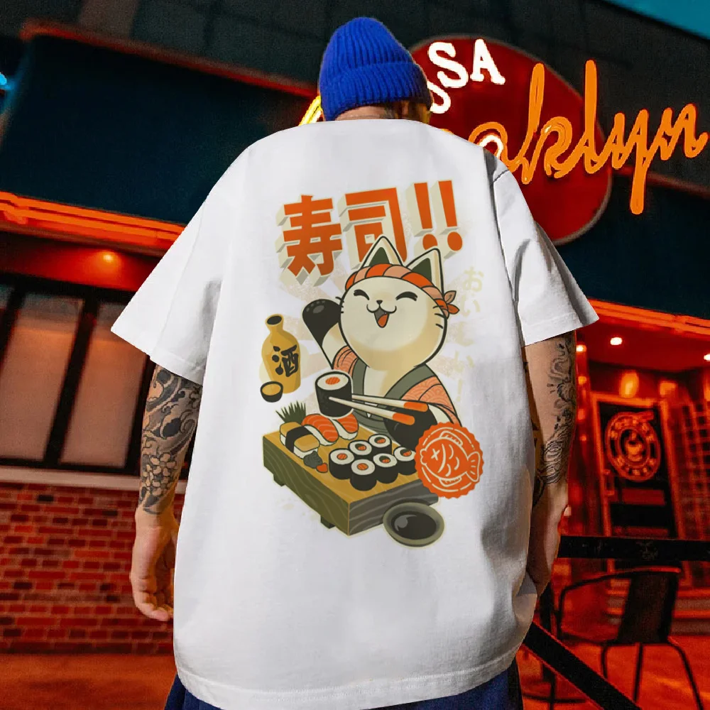 Men’s T-Shirt Sushi Lucky Cat Printed Male Clothing Fashion Casual Short Sleeved Loose Oversized Shirt Street Harajuku Tops Tees
