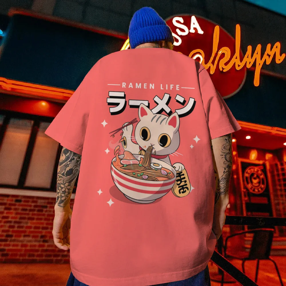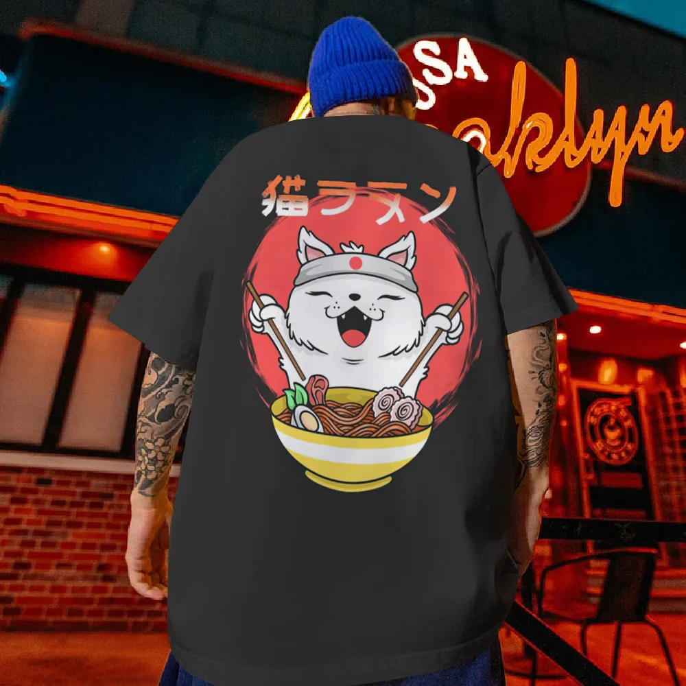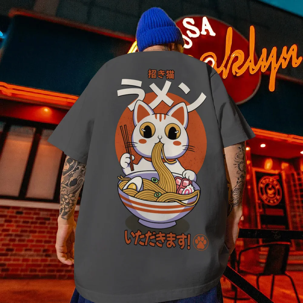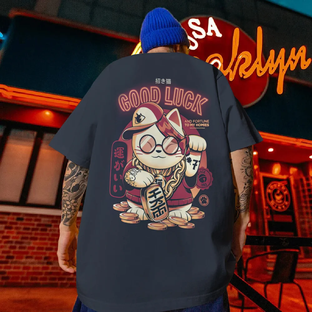 Men’s T-Shirt Sushi Lucky Cat Printed Male Clothing Fashion Casual Short Sleeved Loose Oversized Shirt Street Harajuku Tops Tees
