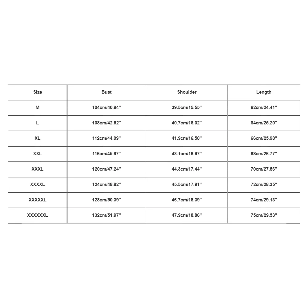 | Size:XXXXXL | Bust:128cm/50.39” | Shoulder:46.7cm/18.39” | Length:74cm/29.13” |