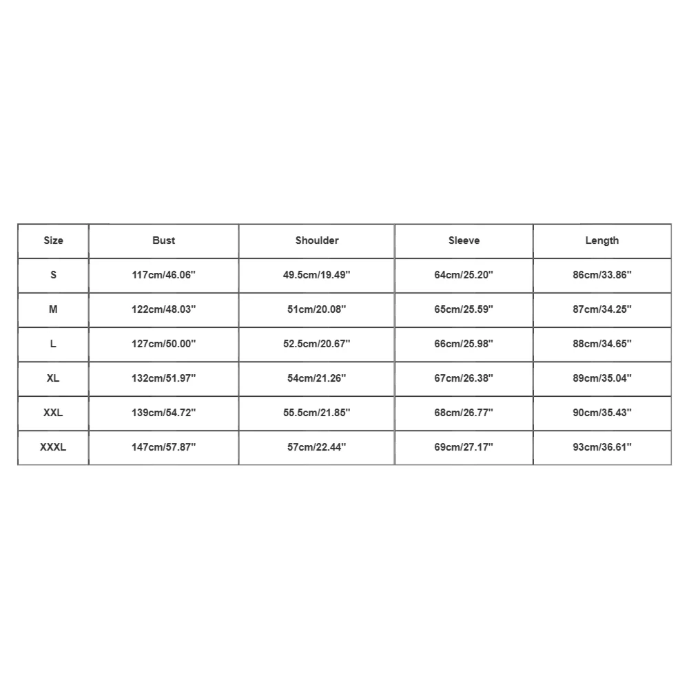 | Size:XXXL | Bust:147cm/57.87” | Shoulder:57cm/22.44” | Sleeve:69cm/27.17” | Length:93cm/36.61” |