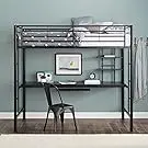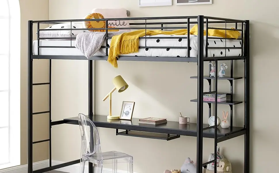 The sturdy, steel frame promises stability and function to support a full size mattress up to 200 pounds. Features full length guardrails and two integrated ladders, one on each end. Includes a detachable desk with a sliding keyboard trey and two shelves for an additional storage. This ideal space-saver is the perfect addition for any bedroom.