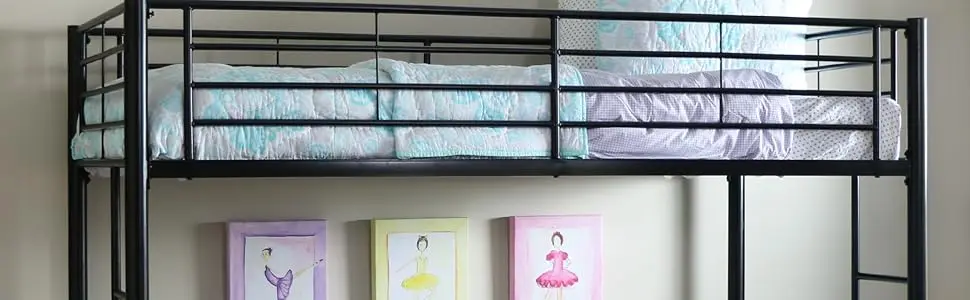 this great lofted twin bed to create space for your home office, craft room, gaming corner, or DJ equipment. The simple silhouette matches any style, so you can tailor your interior design to show off your personality. And if this purchase is for the kids, sleep soundly knowing they are protected by full length guardrails and two integrated ladders for safe climbing.