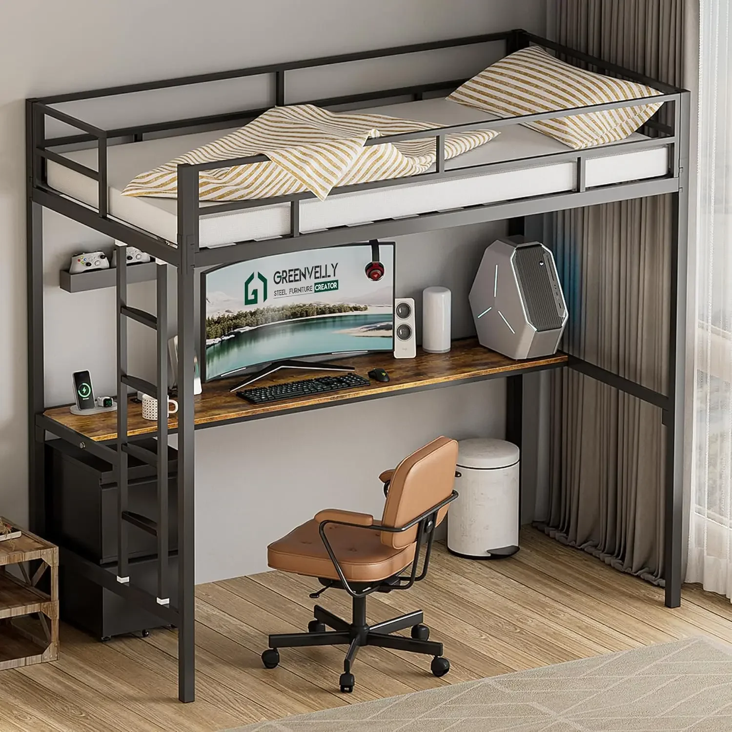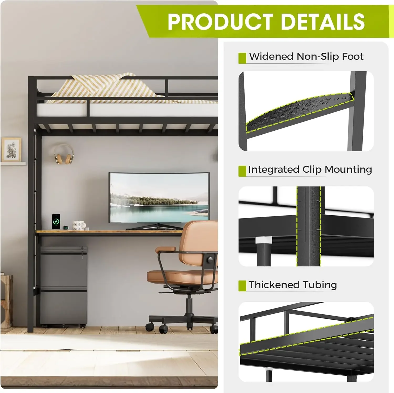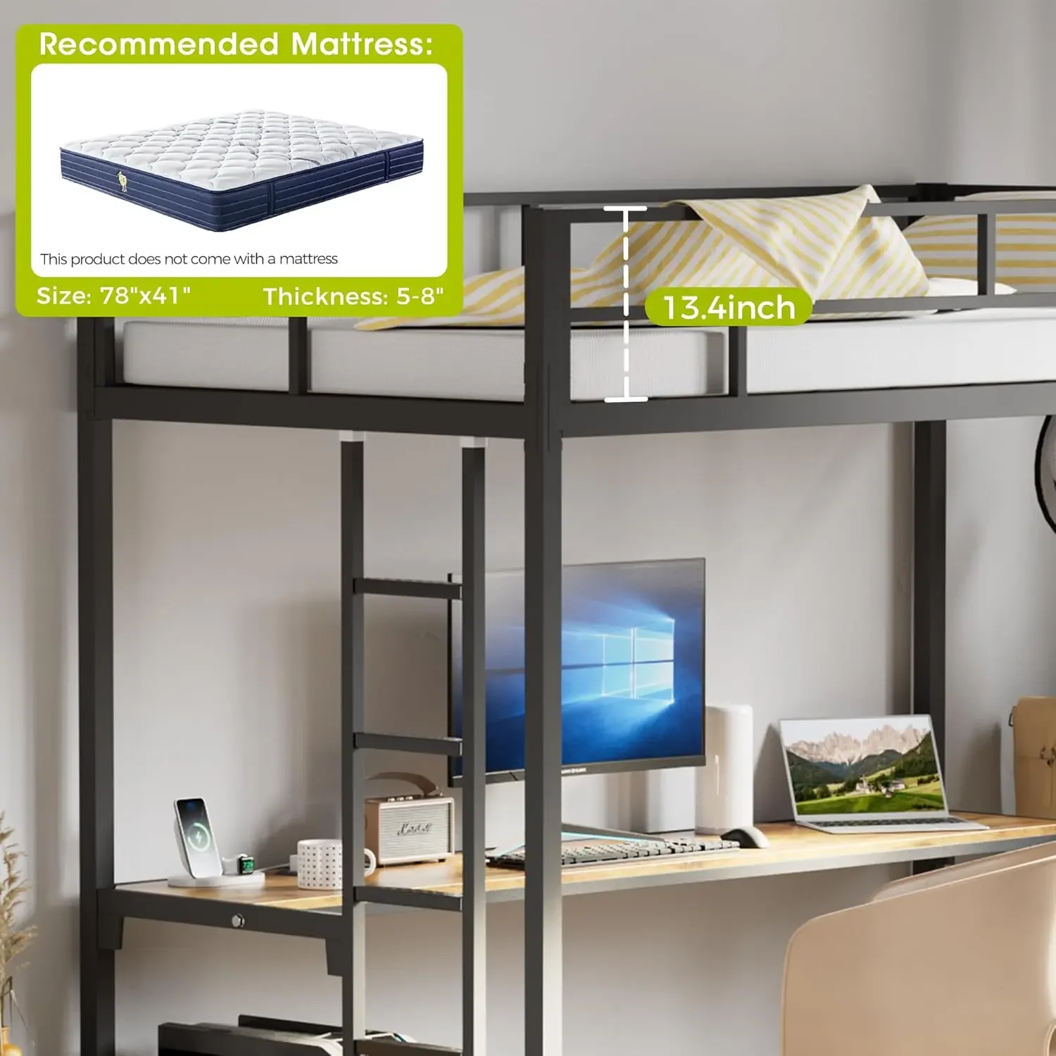 - 【Sturdy & Stable】:twin loft bed with desk made of heavy duty cold rolled steel ,the supporting portion of the bed is supported by 13 sturdy square tubes that can withstand up to 600 Lbs,The ladder is also of the same quality to provide you with a stable load bearing. Metal loft bed with desk is not only corrosion resistant but also easy to clean.