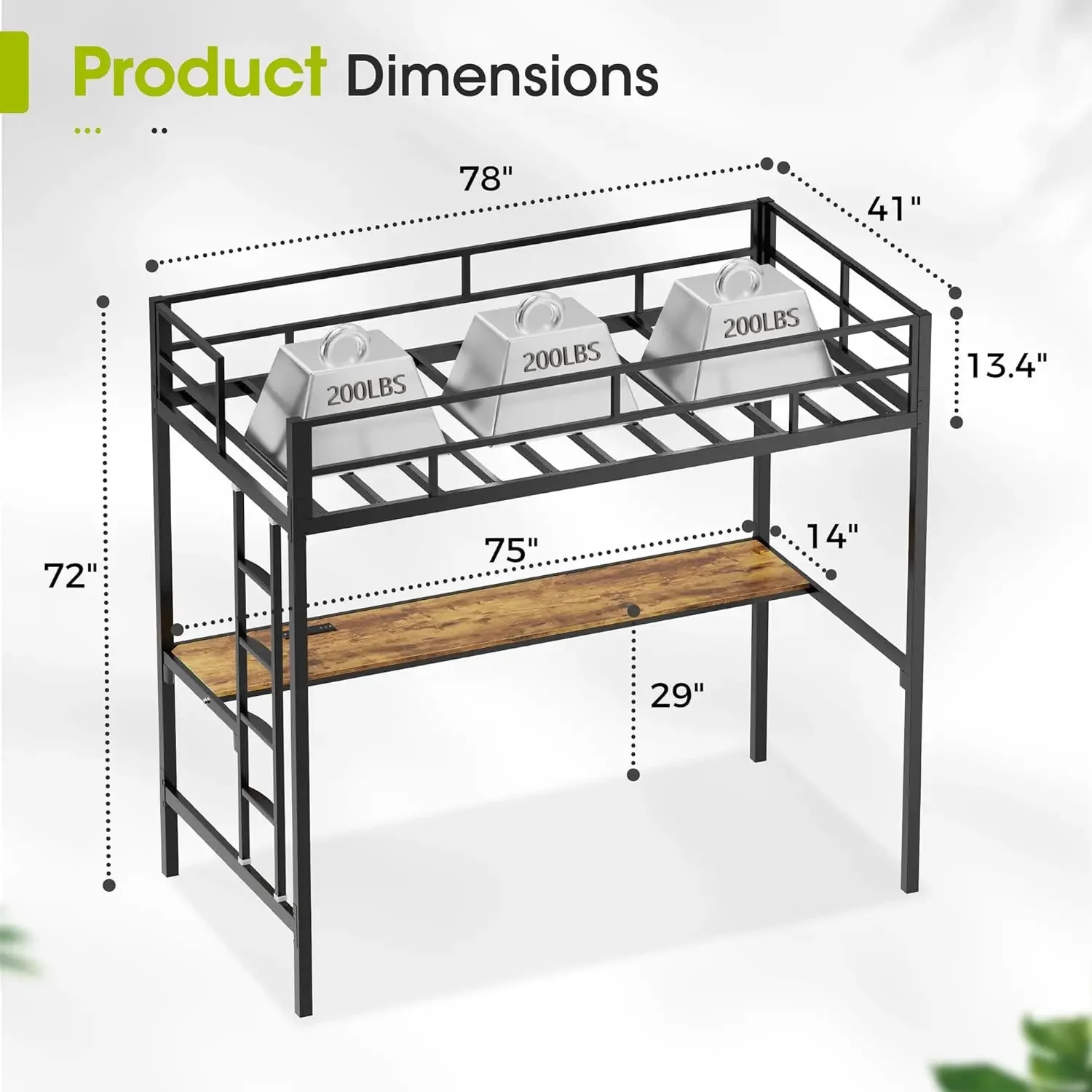 - 【Safety Loft Bed】:heavy duty loft bed with desk is equipped with 13.4 Inches heightened guardrails, ensuring security throughout the night, preventing accidental falls. Besides,We are equipped with anti-toppling designs that you could reinforce with the walls using the screws.