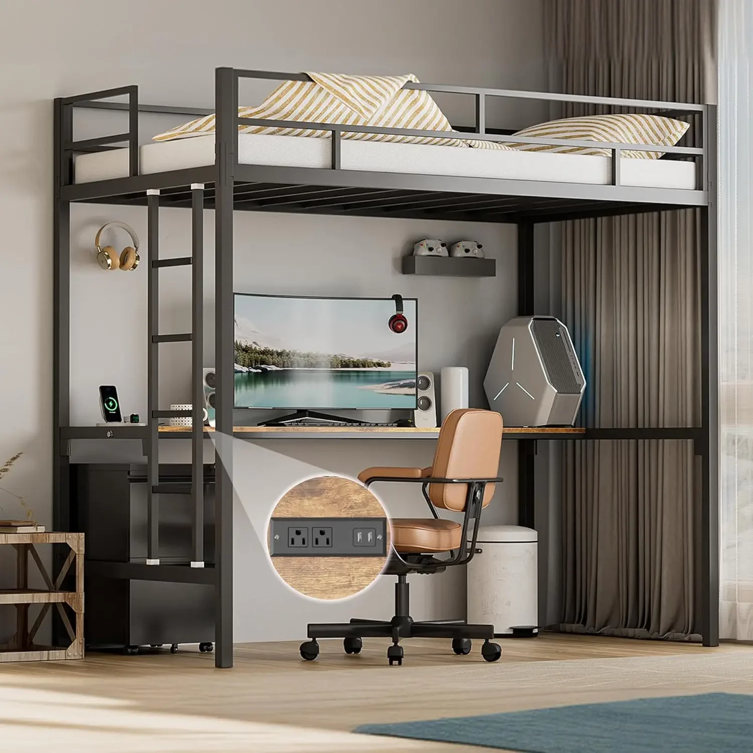 Metal Loft Bed Twin Size with Desk,Twin Loft Bed with LED Lights & Charging Station,Twin Size Loft Bed Without Noise Free, Beds