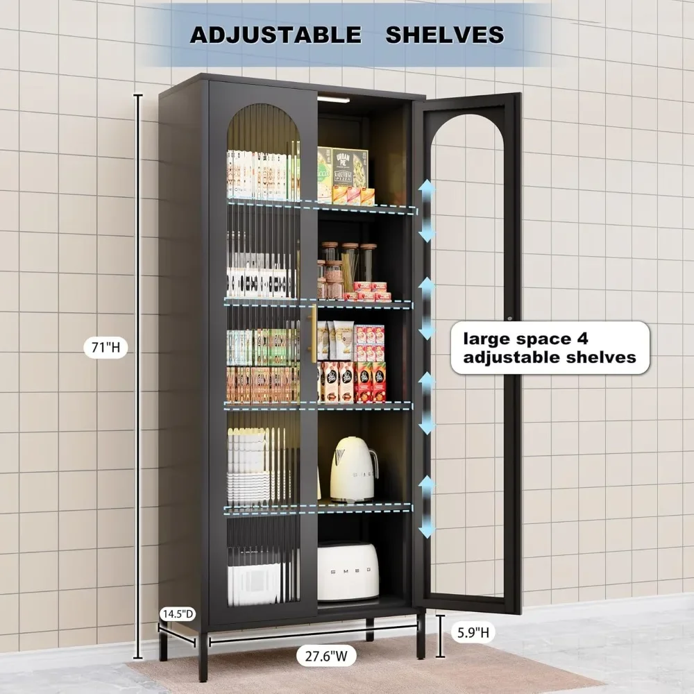Metal Storage Cabinet,71″ Kitchen Pantry Cabinet with Glass Doors,Tall Display Curio Cabinet with Doors and Shelves