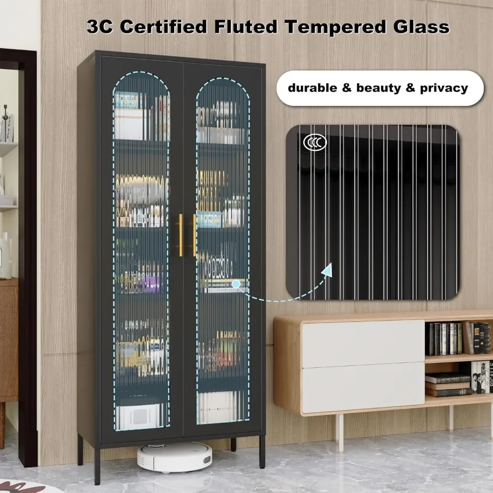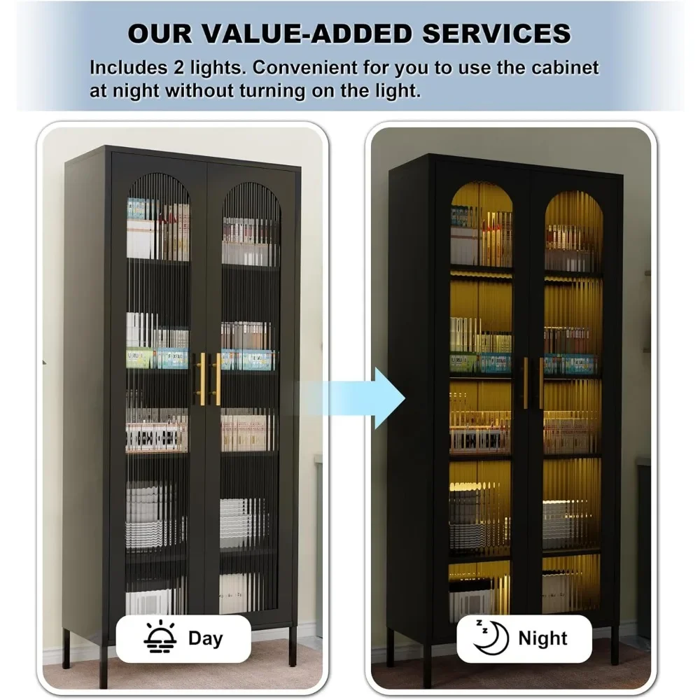 - 【Why Choose Us】𝗢𝗡𝗘:71 inch tall display cabinet with glass doors.𝗧𝗪𝗢:Curved fluted glass,more beautiful and stronger than ordinary glass. 𝗧𝗛𝗥𝗘𝗘:Two free LED lights:The 5-tier cabinet contains two lights that can be installed at will, and the lights can be automatically sensed and lit.Make your cabinet glass more beautiful under the refraction of light.