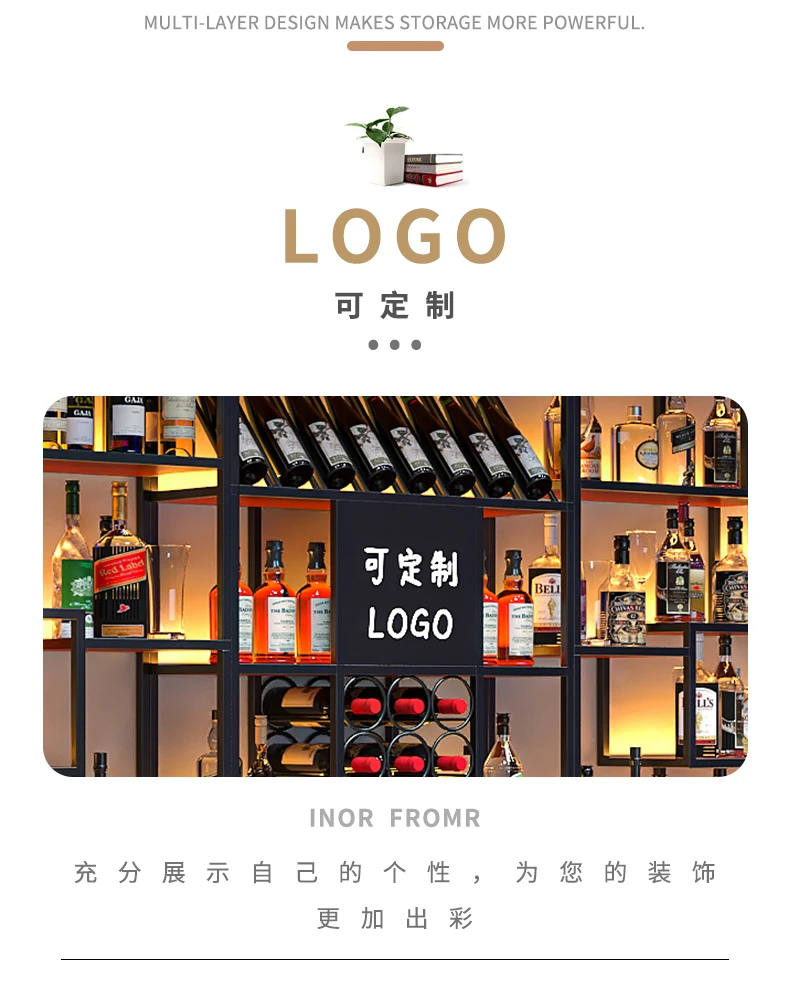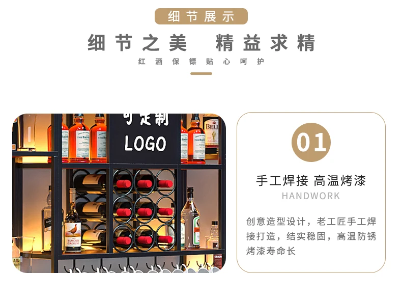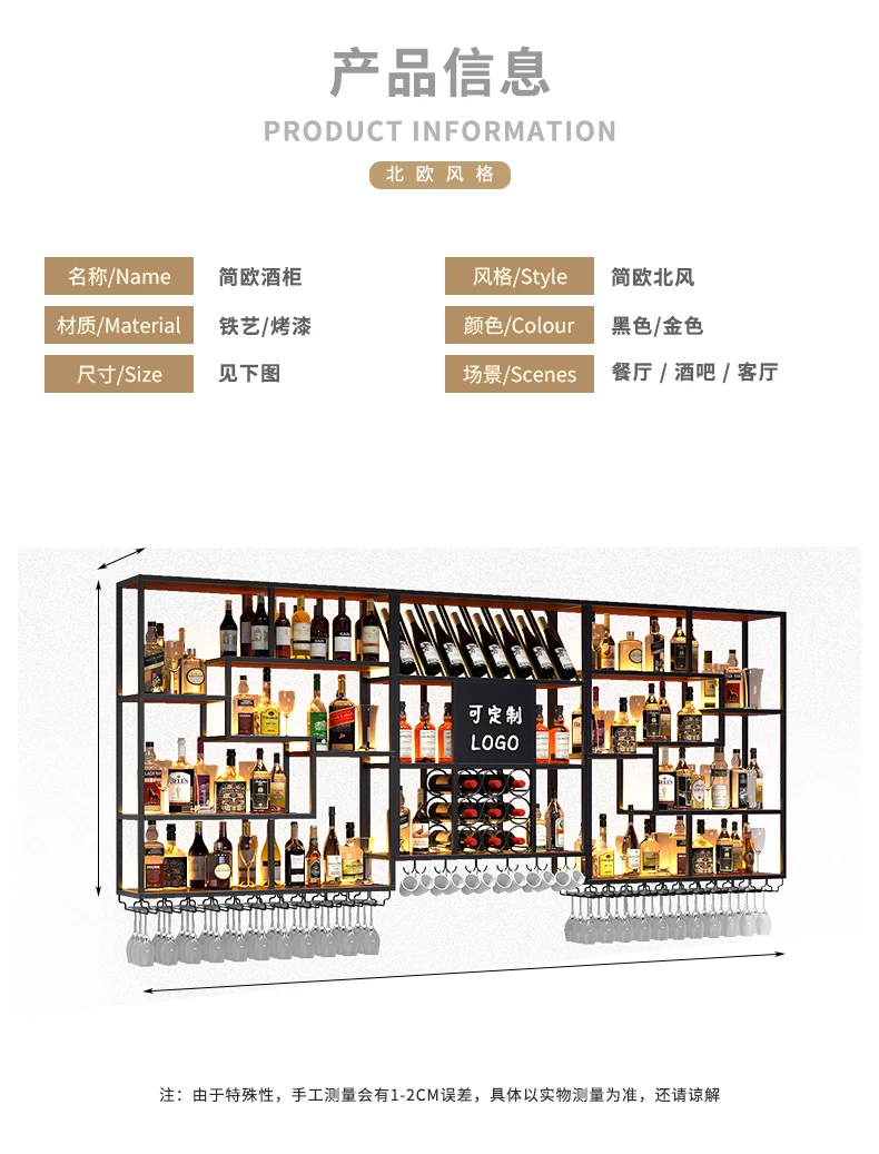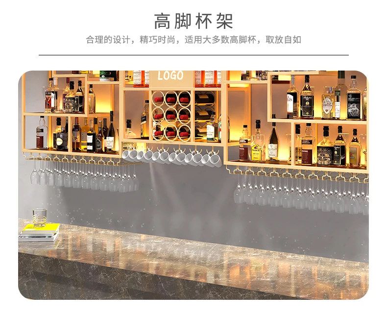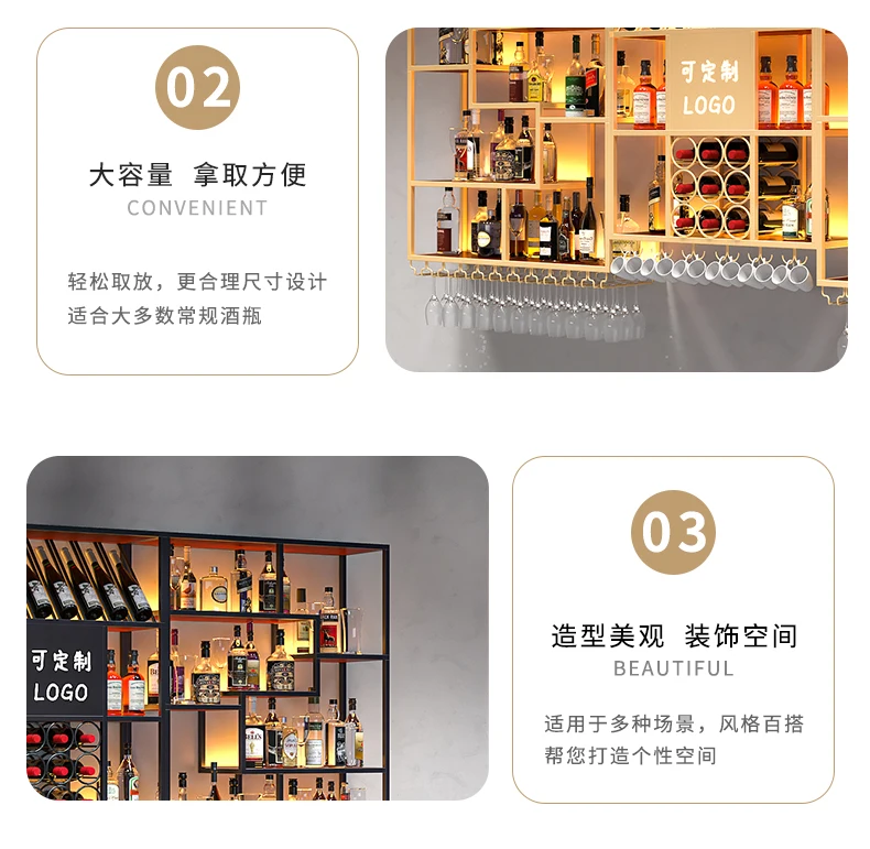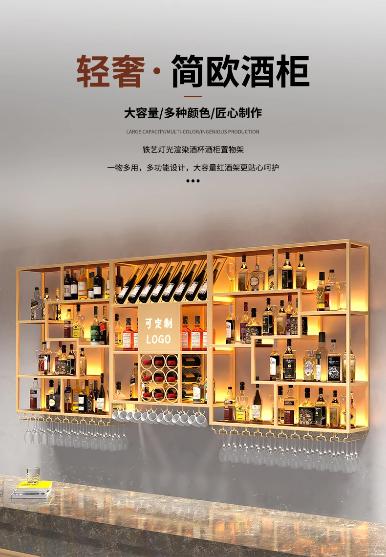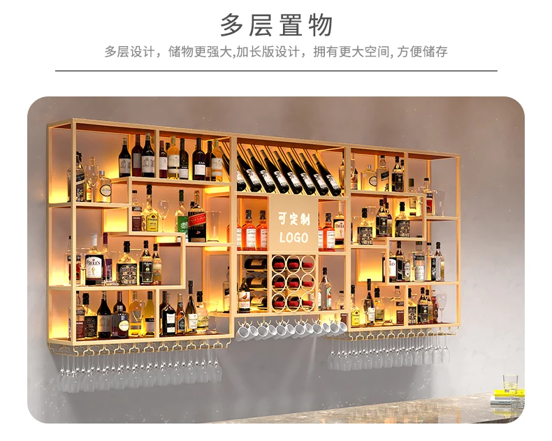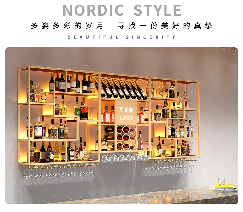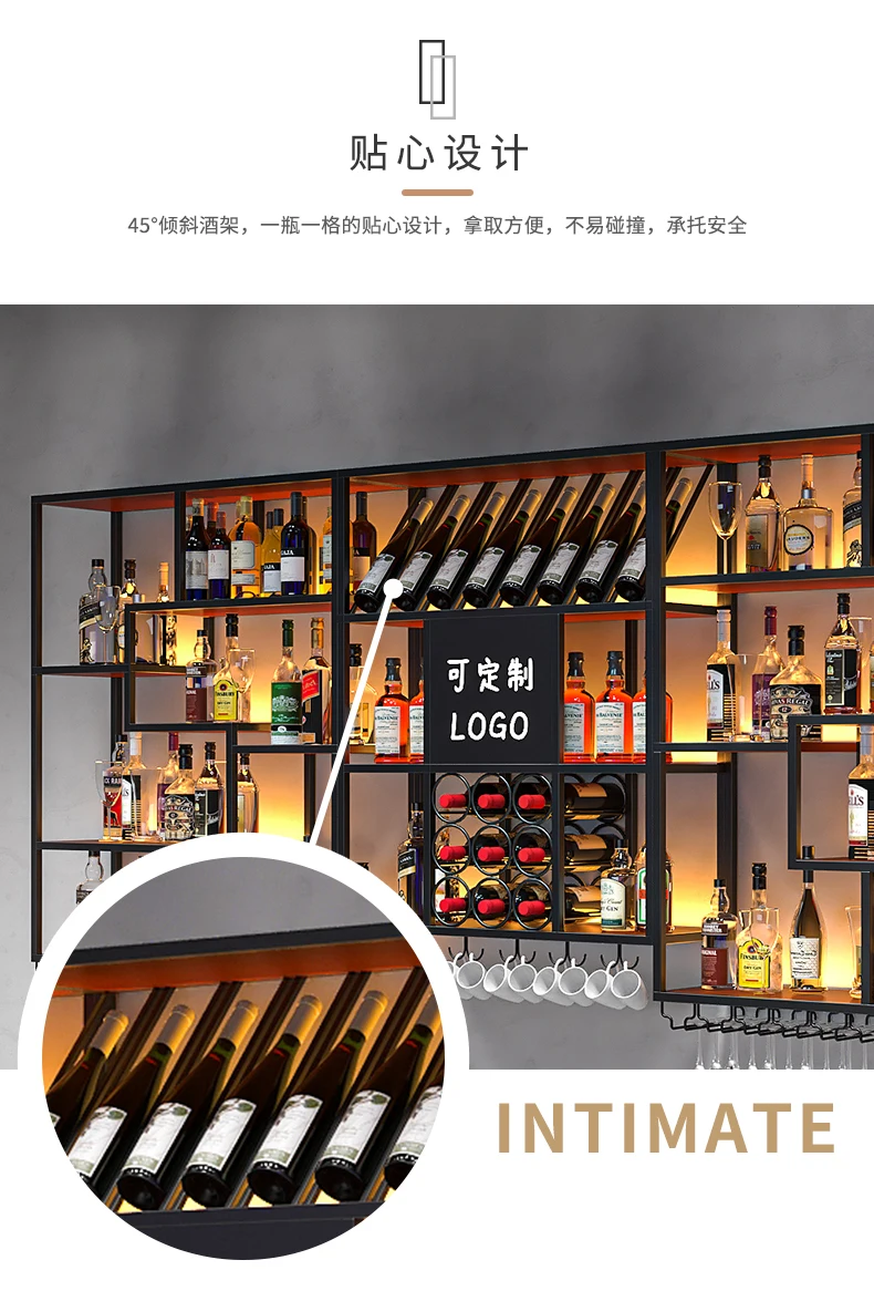 Nordic Wrought Iron Wine Bar Cabinet Home Wall Mounted Industrial Style Wine Rack Creative Bar Display Cabinet with Light