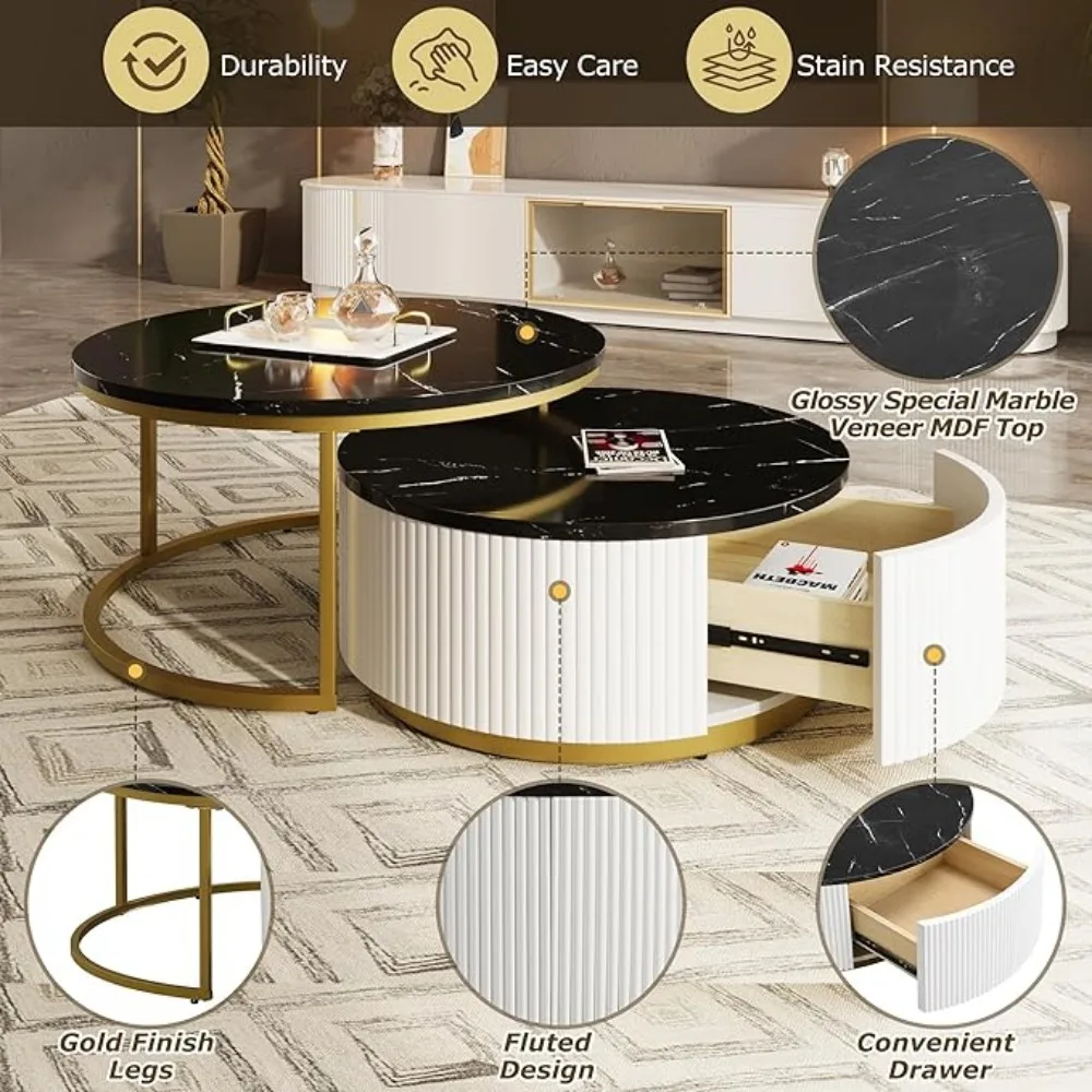 - 【Nesting Design】This coffee table set includes two round tables that nest together, providing flexibility in arranging your space and offering additional surface area when needed.