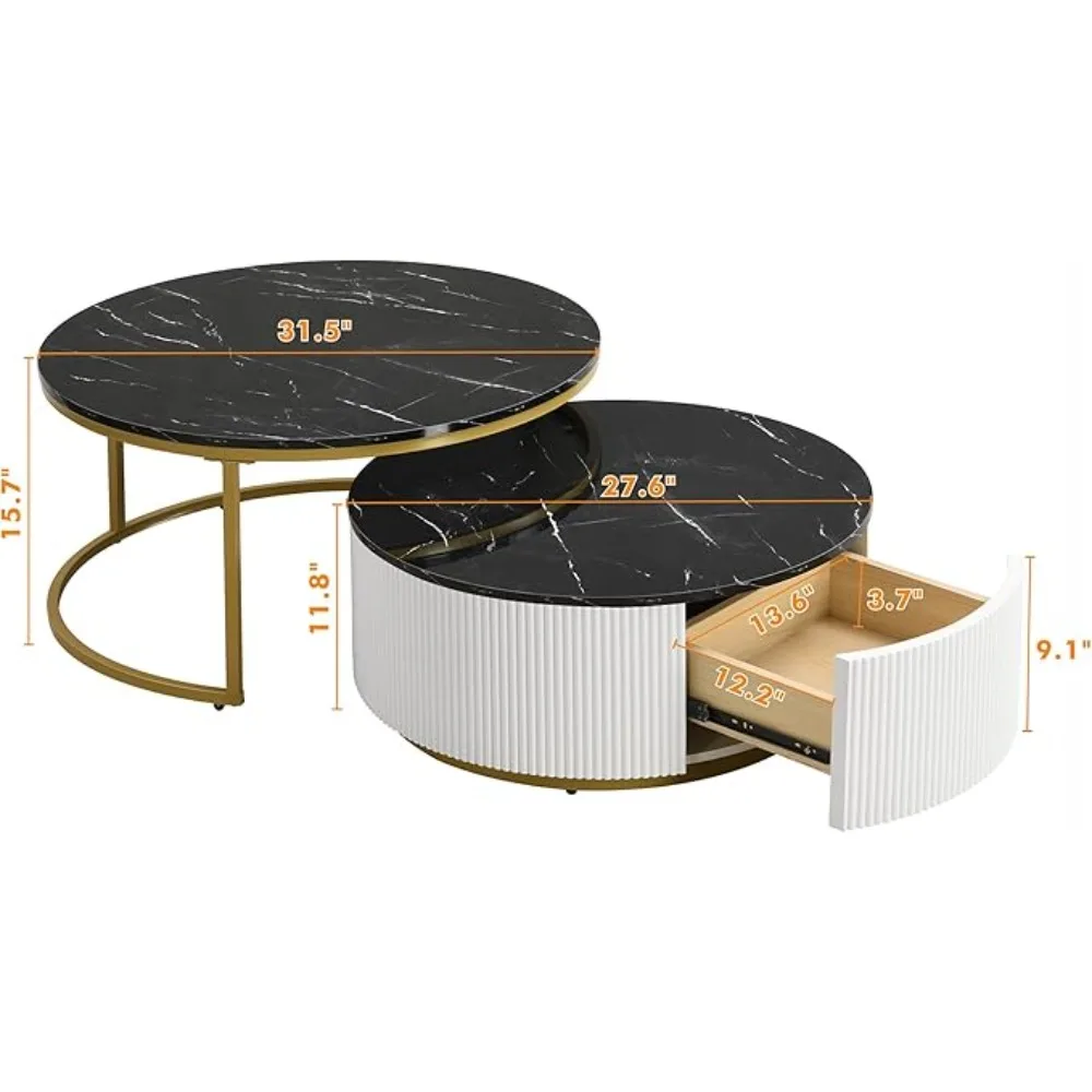 Modern Nesting Coffee Table with drawer,round,soild wood tabletop,metal frame,simple Sliding design tea table for Living Room