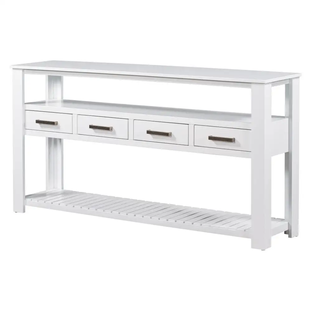 Modern Sofa Console Table with 4 Storage Drawers, Open Compartment and Bottom Slatted Shelf, Wooden Entryway Hallway Foyer