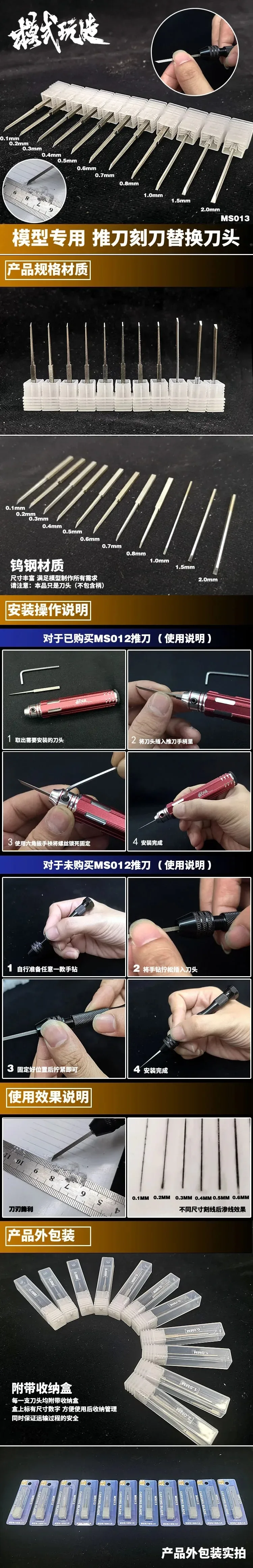MS013 0.1mm~2.0mm Tungsten Steel Replacement Blade Cutter Head for Model Tool Push Carve Knife