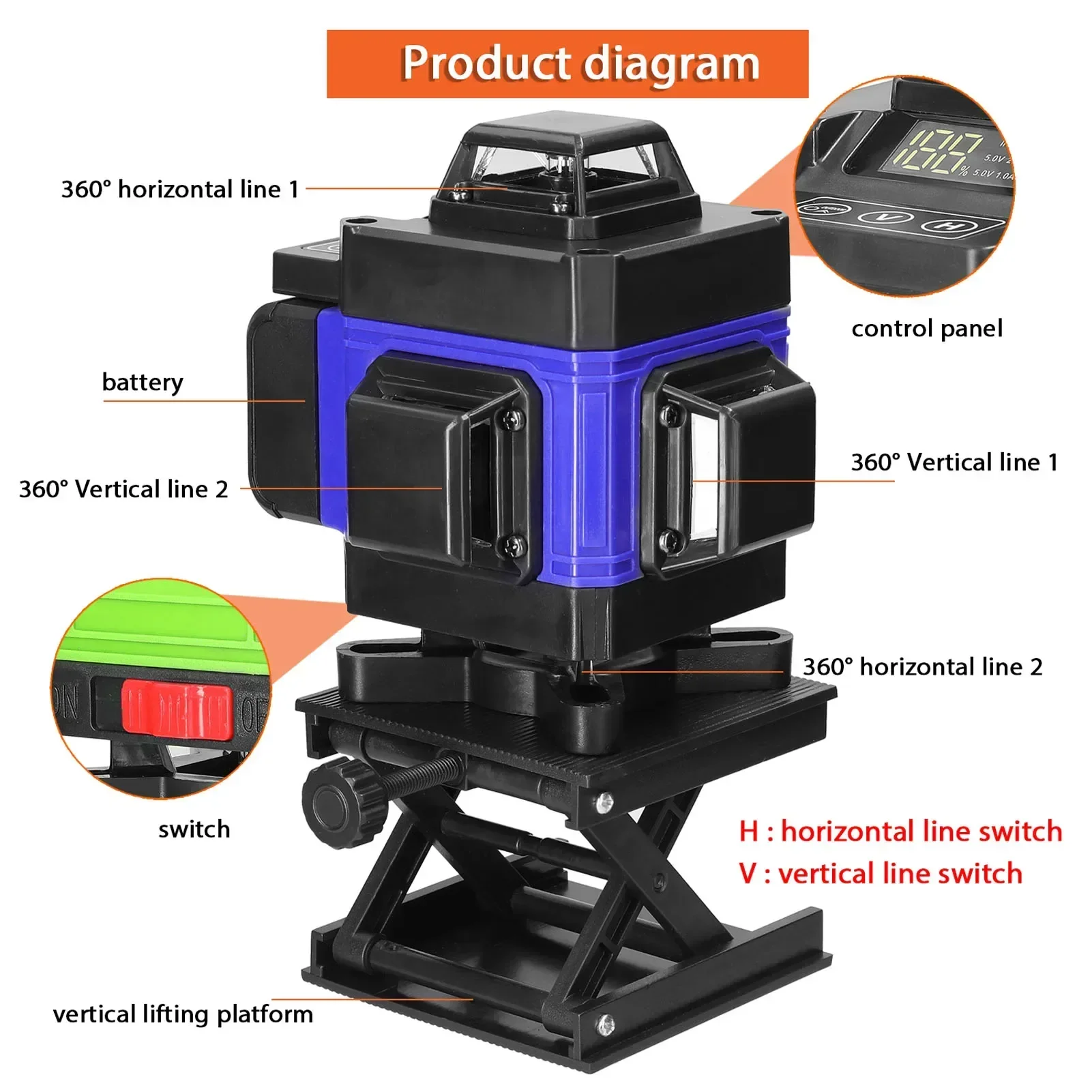 Comes with one remote controller, “V”=vertical line, “H”=horizontal line, and you can adjust the brightness of laser light easily by press the “+”or “-” button.
