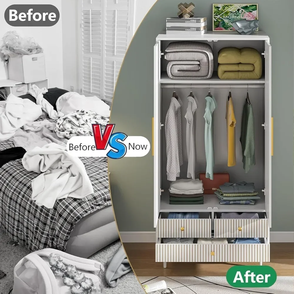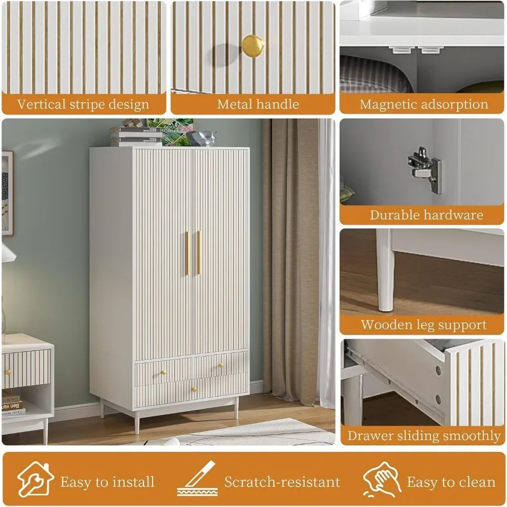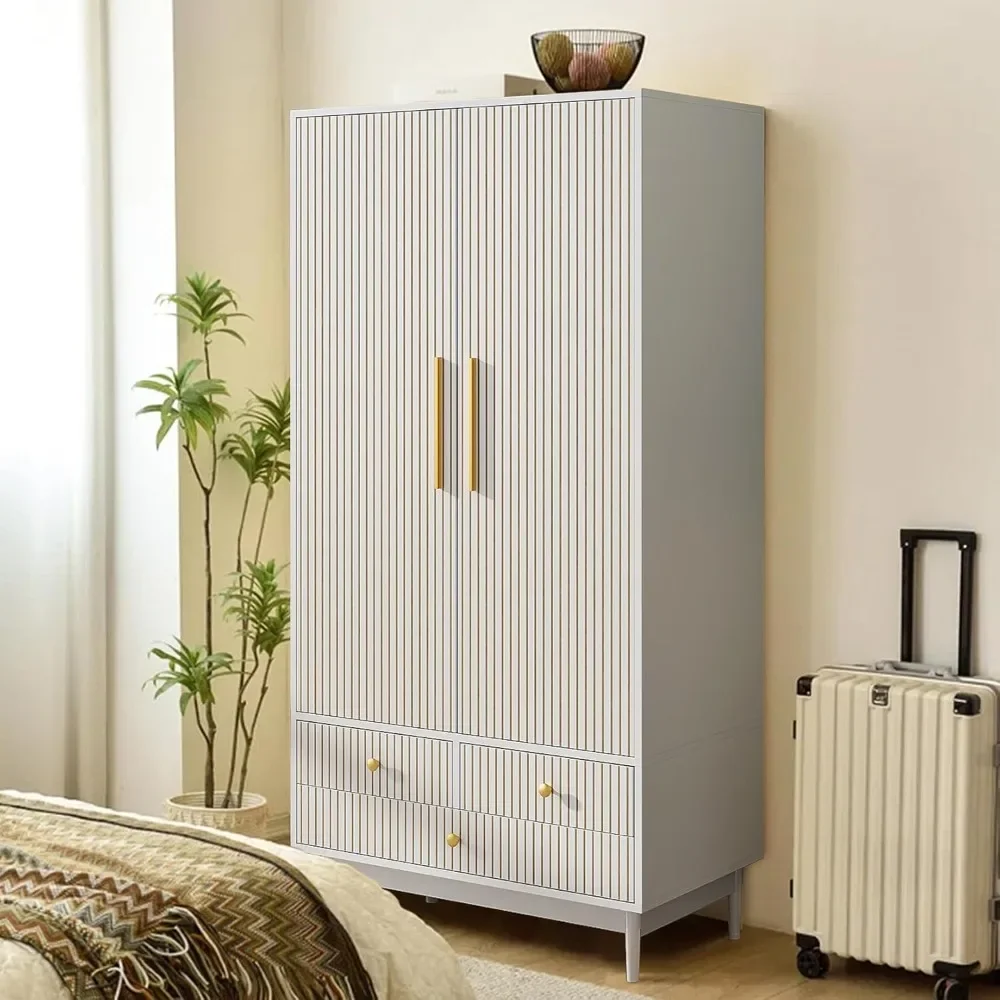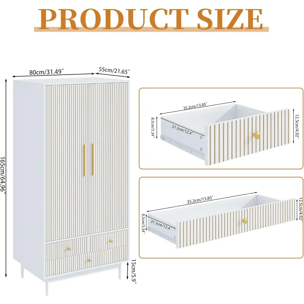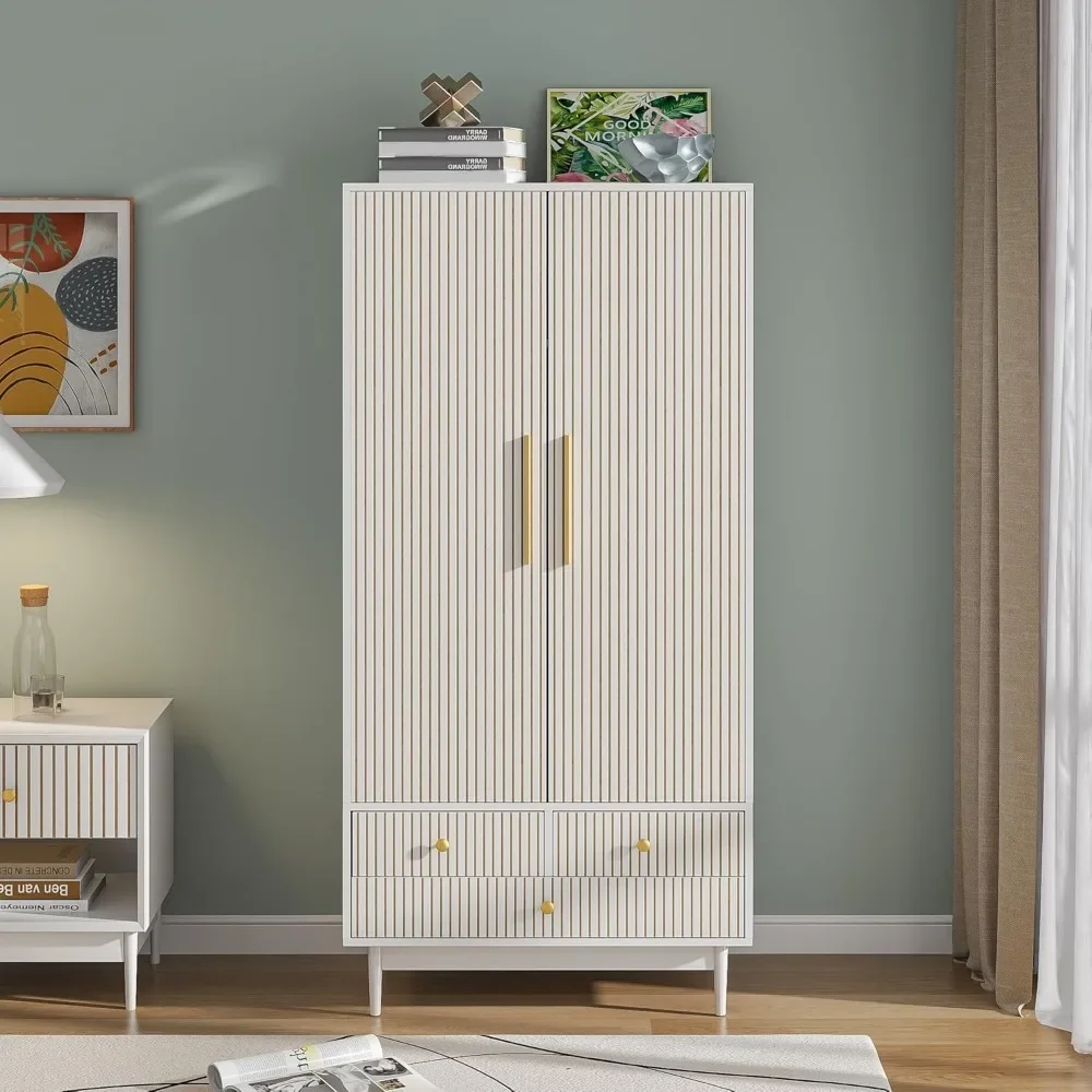 - 【MODERN AND STYLISH CHARM】This wardrobe consists of an elegant white finish with unique groove stripe design, exquisite gold handles and a simple wooden base, exuding simplicity and sophistication. The groove design and smooth texture give the wardrobe a modern feel, and the bottom base adopts a retracted design, showing an elegant and noble charm, which goes well with many different home decorations.