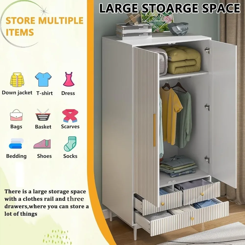 - 【LARGE CAPACITY WARDROBE】Give your room a new look with use our large capacity double door wardrobes! The large space of this wardrobe provides you with ample storage space for your clothes and belongings.The detachable hanging rod provides convenient length hanging space, which is perfect for longer clothes such as dresses, suits and coats.The large partition inside the cabinet doors can store bedding. The 3 spacious drawers at the bottom can store socks,underwear and personal items.