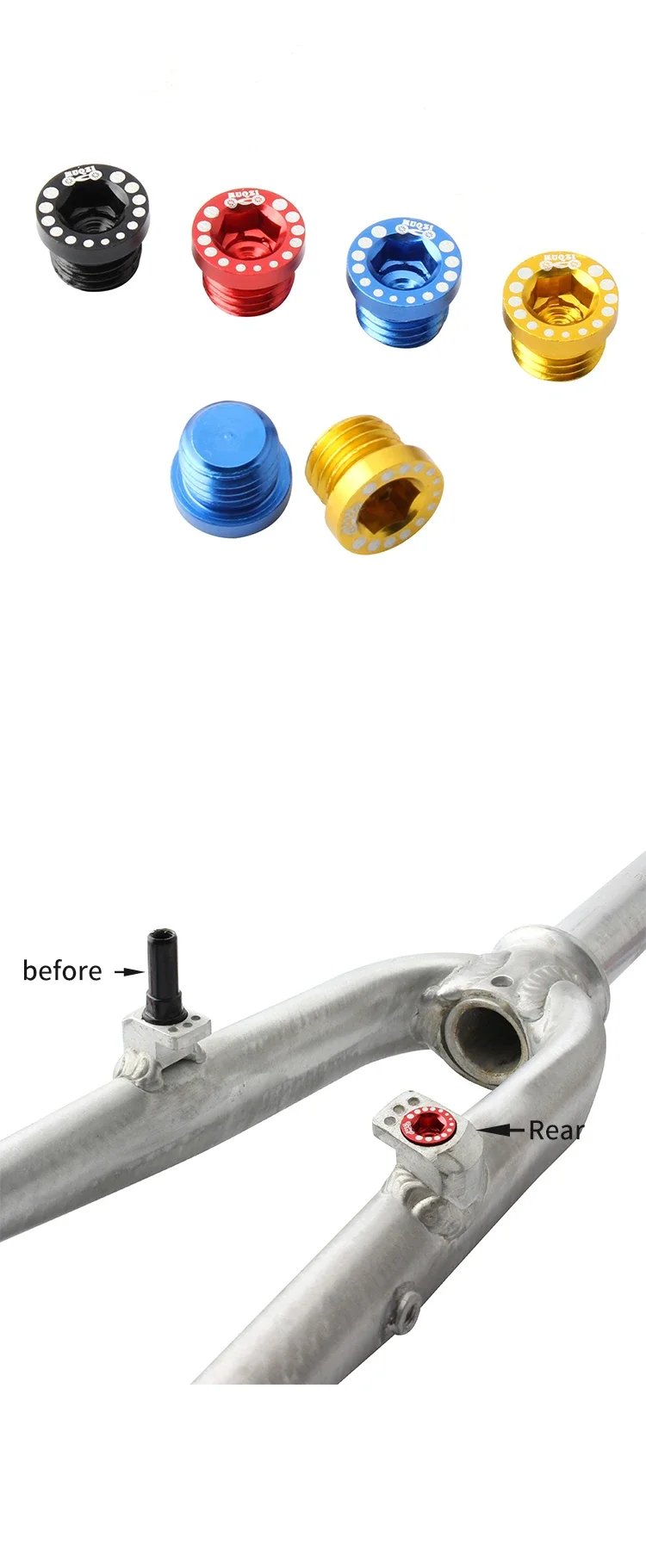 Name: V brake column screw plug Suitable for mountain bike folding bikes can be installed as long as the base size with V brake column is M10 * 1.25. Specification: M10 * 1.25 Material: aluminum alloy Size: 12 * 9.6mm Packing size: 60 * 40 * 10mm Net weight: 1.5g Gross weight: 10g Packing list: Screw * 4 Function: It is used to decorate the bicycle. If the V brake post screws are no longer used to install the brakes, the left V brake posts will not look very pleasing to the eye. This small plug can perfectly solve the problem. It is not only beautiful, but also dust-proof and sand-proof. If you want to replace the V brake post for installation in the future, the hole will not cause the problem of thread irregularity due to dust accumulation over time.