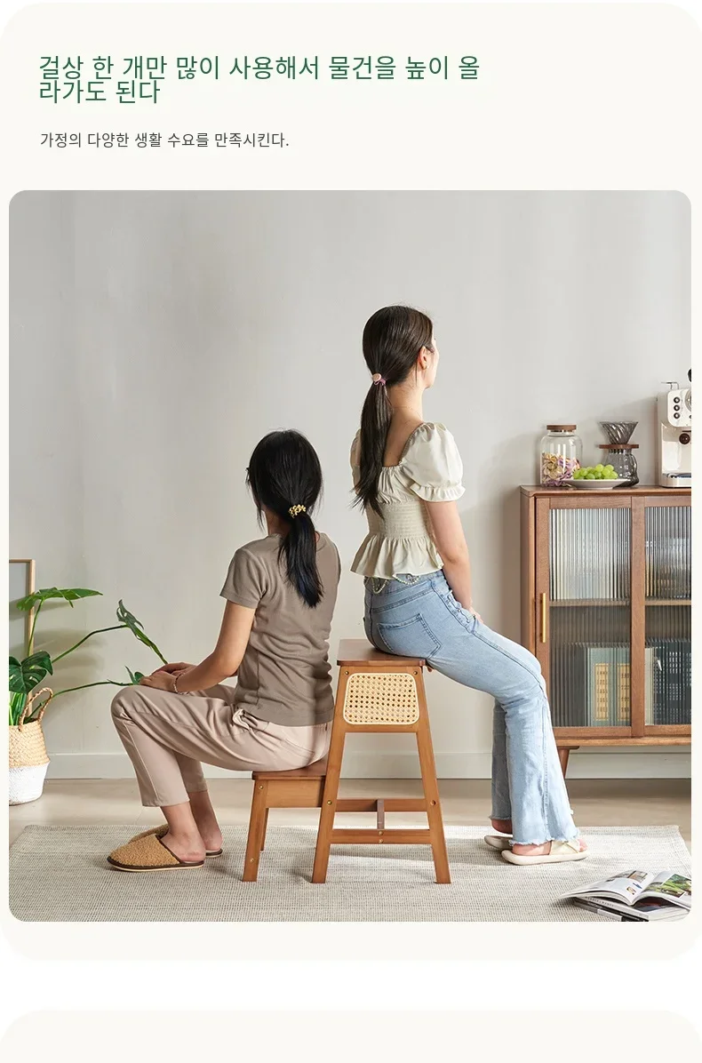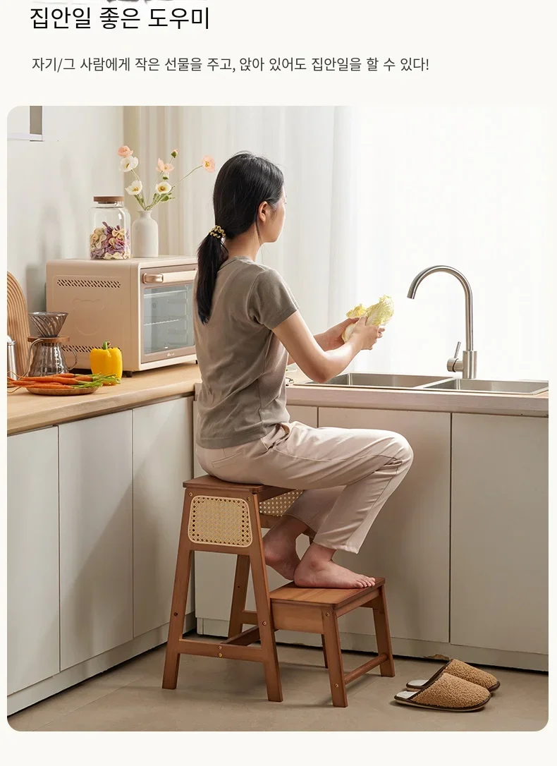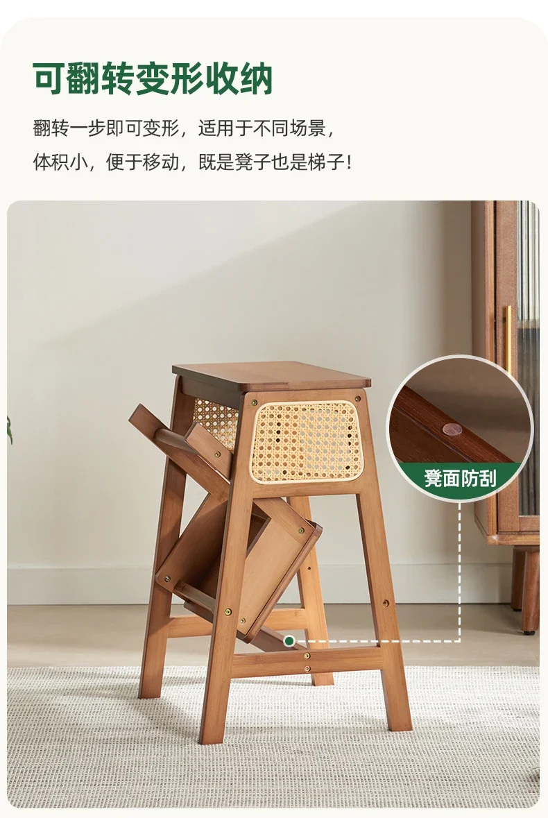 Natural Bamboo Herringbone Ladder Multi-functional High Stools Kitchen Resin Rattan Weaving Ladder Stool Flip Folding Step Stool