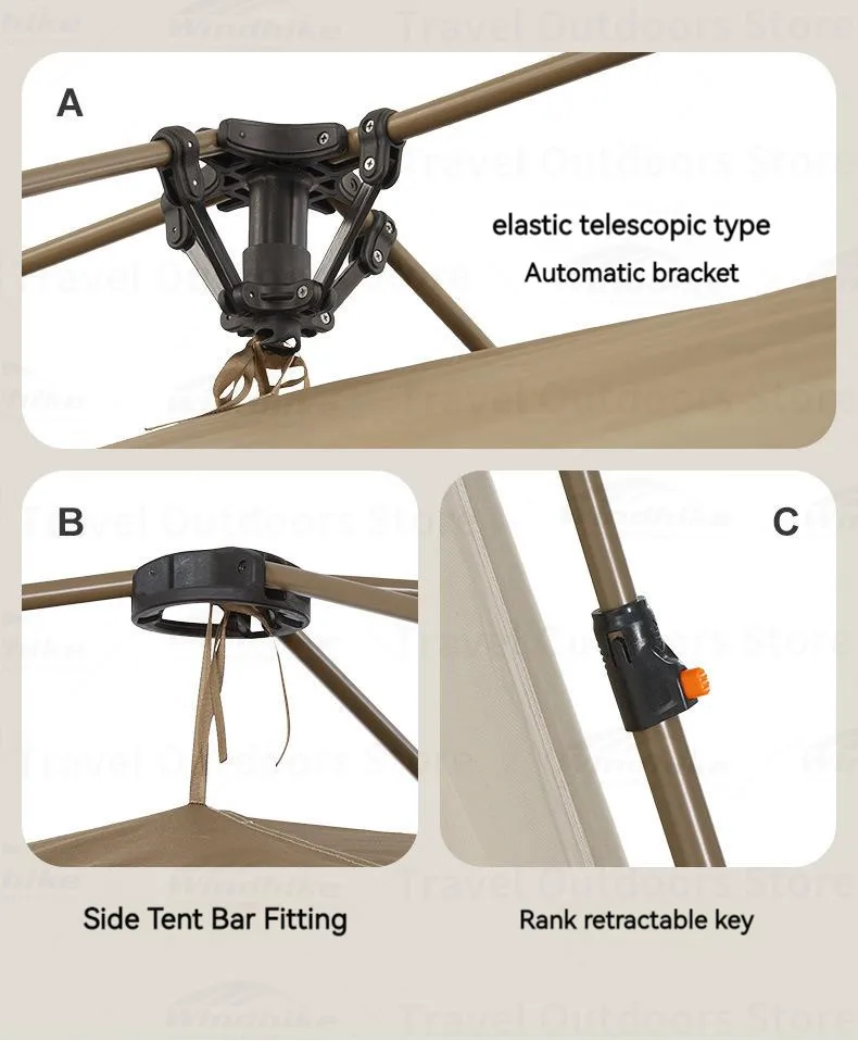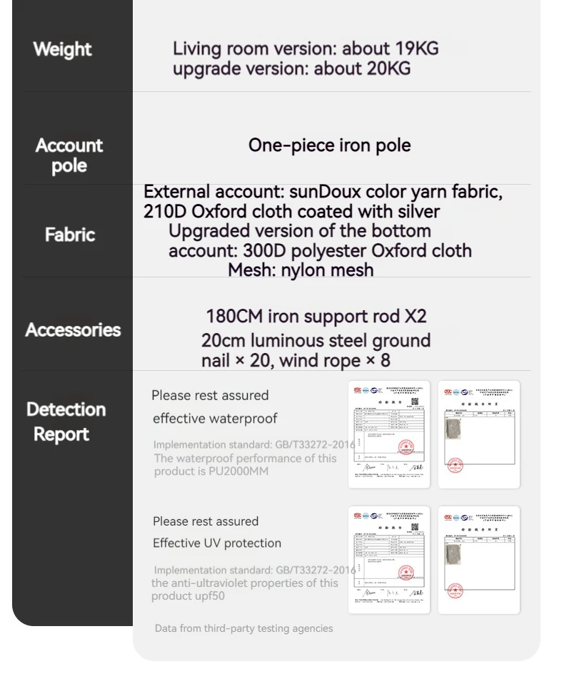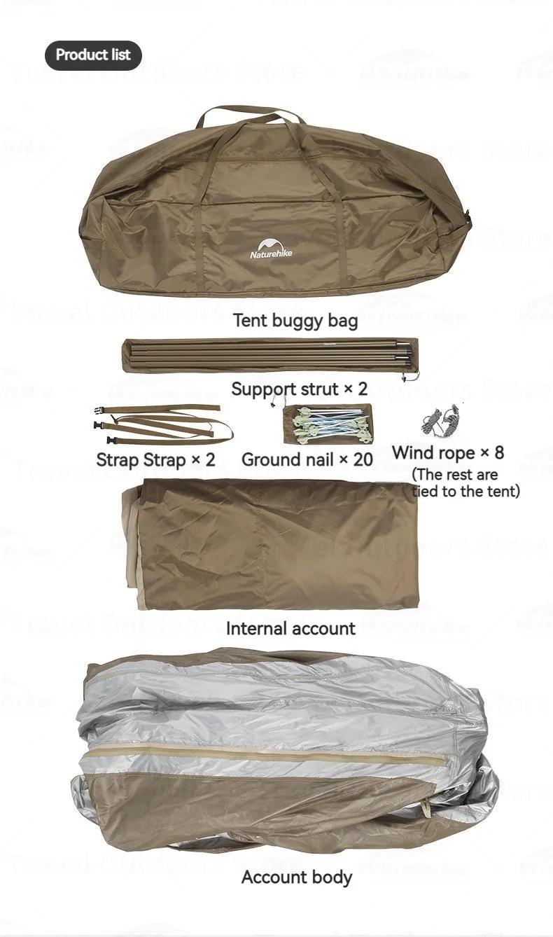 Product List: Tent buggy bag, 180cm iron support strut x 2, Strap x 2, 20cm luminous steel ground nail x 20, Wind rope x 8, Internal account, Account body