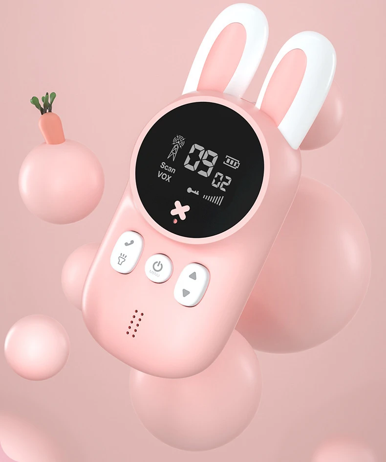 Sleek, brightly colored kids’ walkie talkies in a super cute bunny design, attractive for girls and boys. Durable and non-toxic ABS plastic material, and 0.5W transmission power delivering very low radiation, 100% safe for children to use. Great for both indoor and outdoor use. Each receiver runs on 4 AAA batteries (not included).