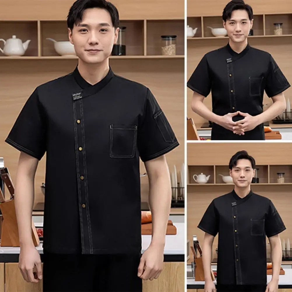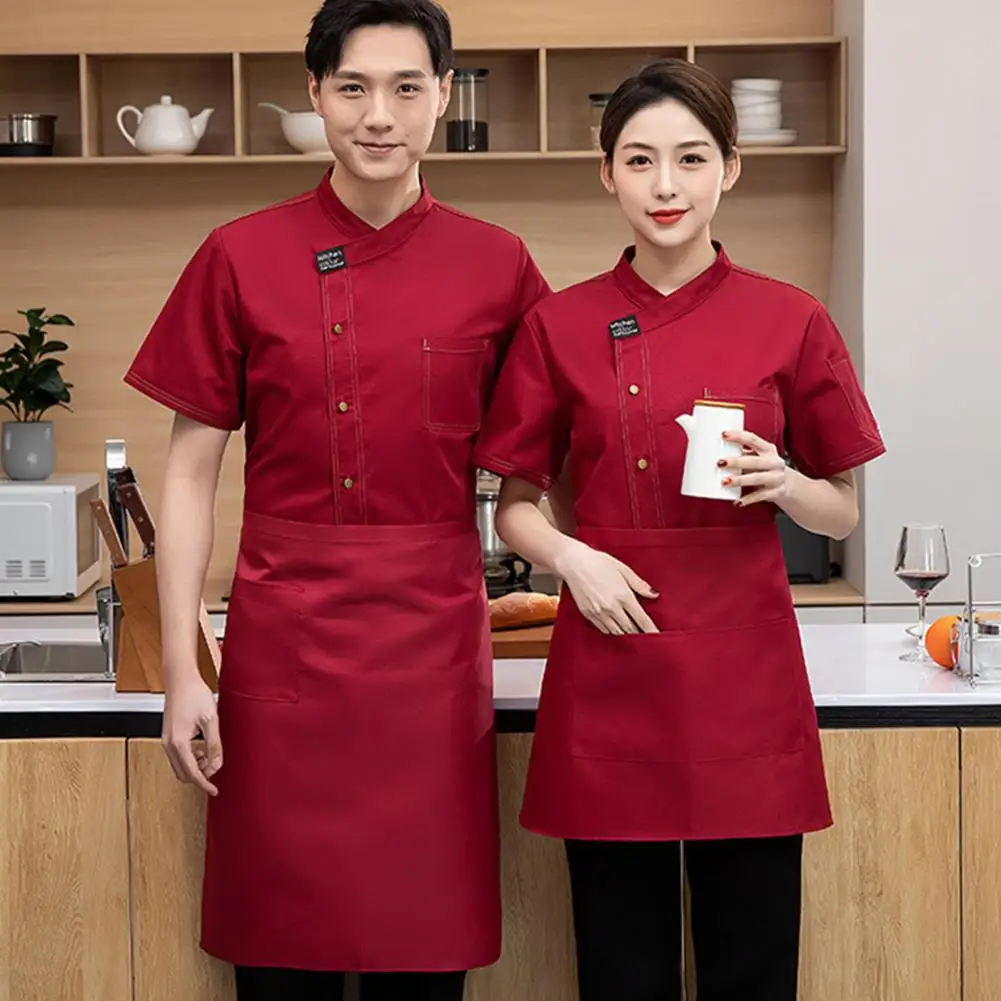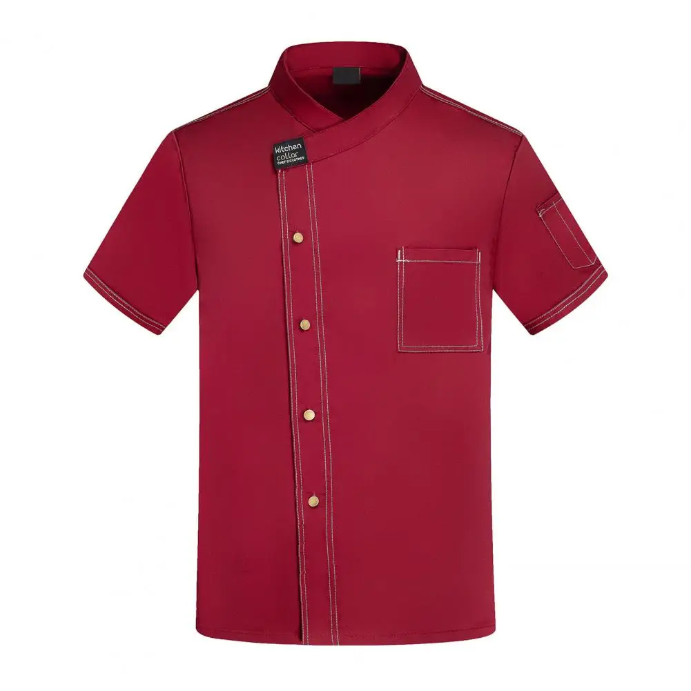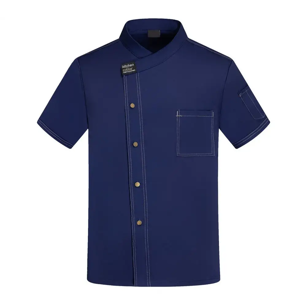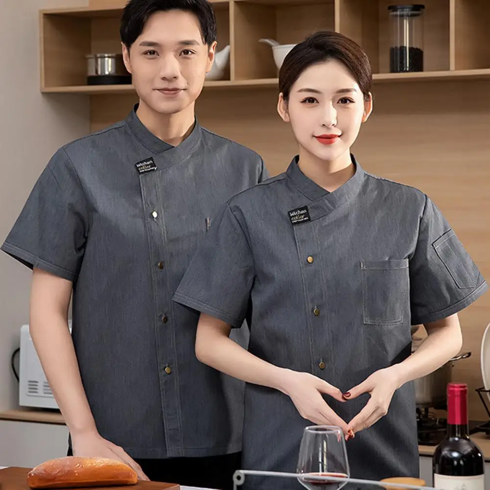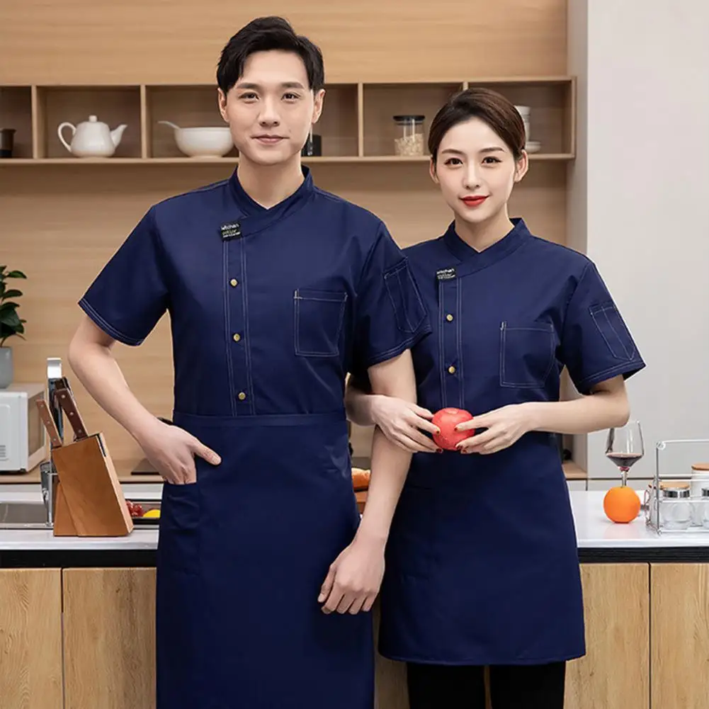Unisex Stand Collar Short Sleeve Chef Uniform Solid Color Single Breasted Patch Pocket Restaurant Bakery Waiter Uniform