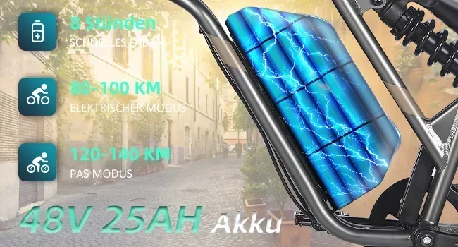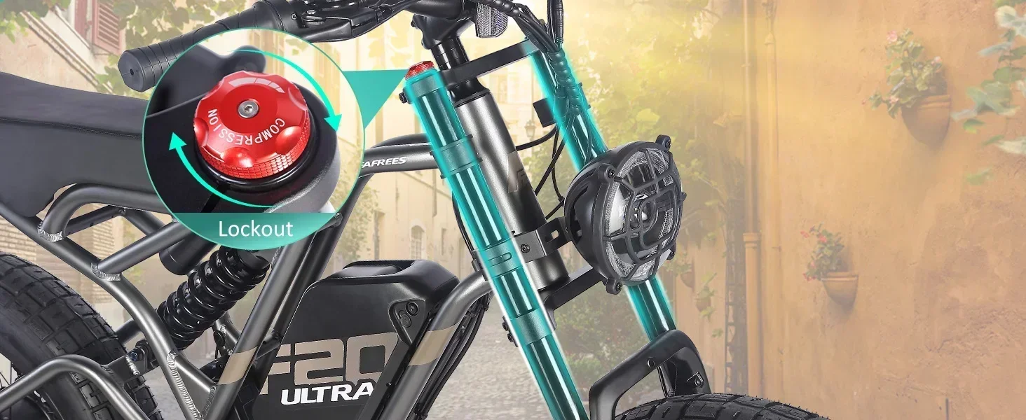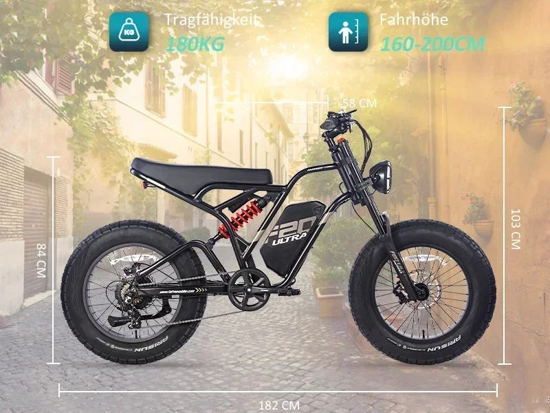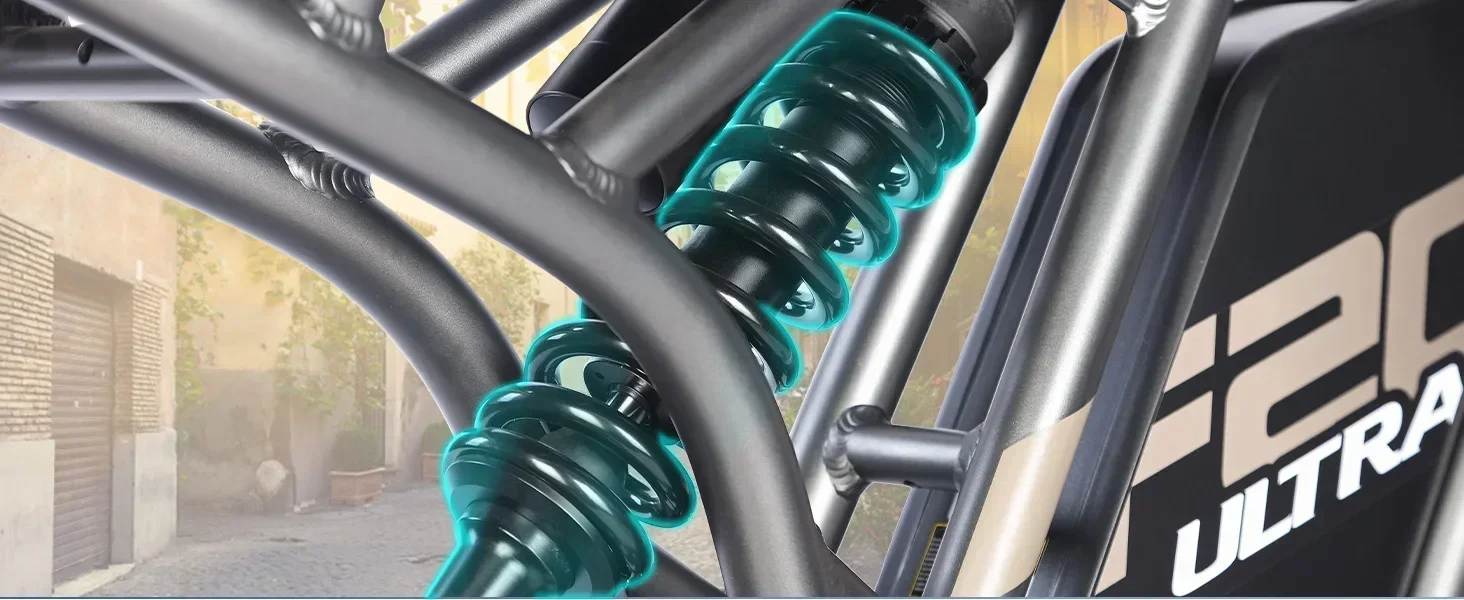 Machen Sie ein Fahrradtour mit Fafrees F20 ULTRA! Mit massiven 25 Ah/1500Wh Batterie, die eine ausgedehnte Fahrt garantiert. Bewältigen Sie jedes Gelände mit Leichtigkeit, dank der robusten 20*5,0 Fat Reifen, und genießen Sie eine ruhige und komfortable Fahrt mit der Doppelfederung.