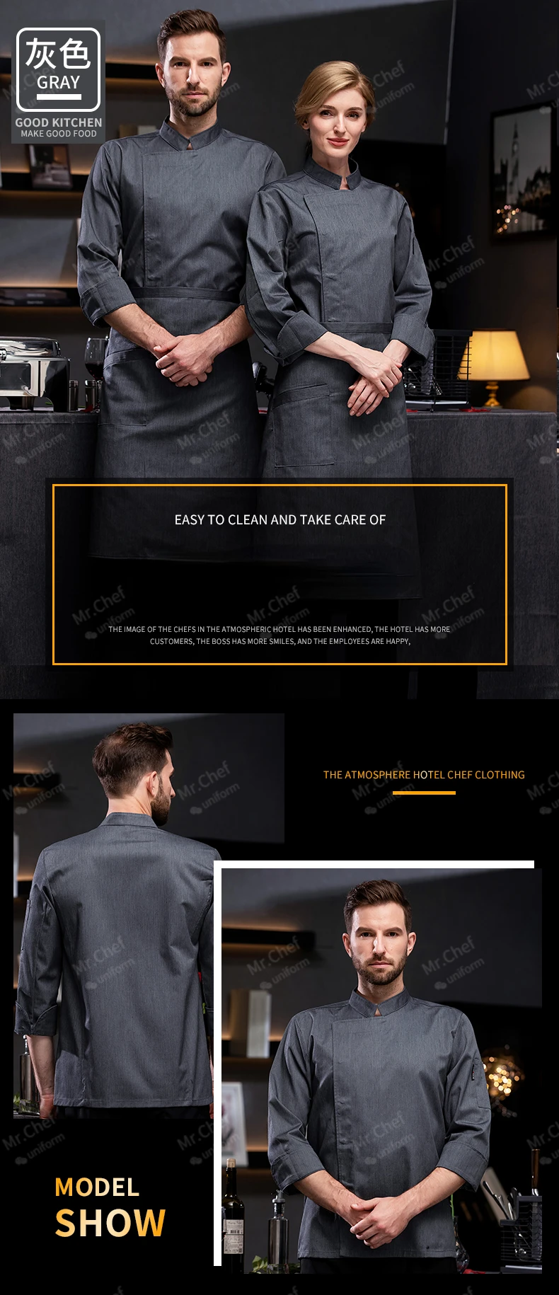 New grey chef uniform long sleeve chef Jacket T-shirt Hotel chef top restaurant work coat Bakery Breathable Cooking clothes logo