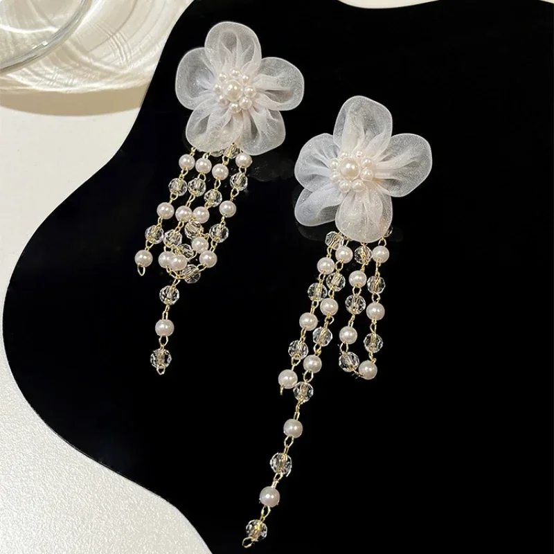 New Vintage Long Tassel Acrylic Flower Pearl Crystal Drop Earrings for Women Hyperbole Personality Large Earrings Jewelry