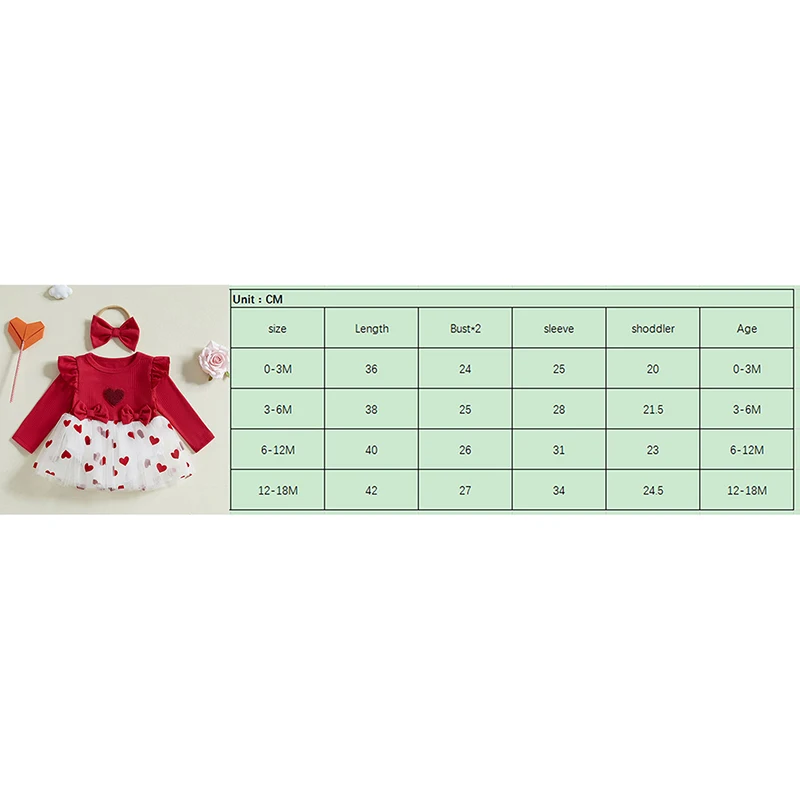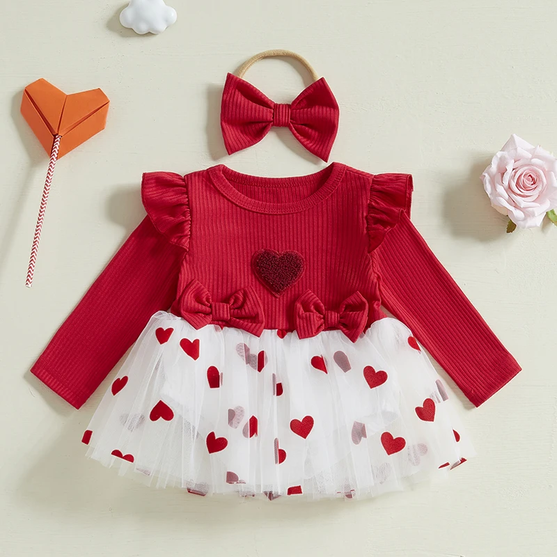 Newborn Baby Girl Valentines Day Outfit Heart Ruffle Long Sleeve Romper Dress Bow Headband 2 Pcs Spring Outfit