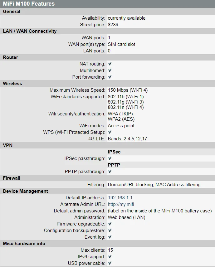 information is protected lock and key. Advanced security features include hacker prevention, corporate VPN compatibility, password protection and more. Follow main specification of Mi Fi M100 for reference: