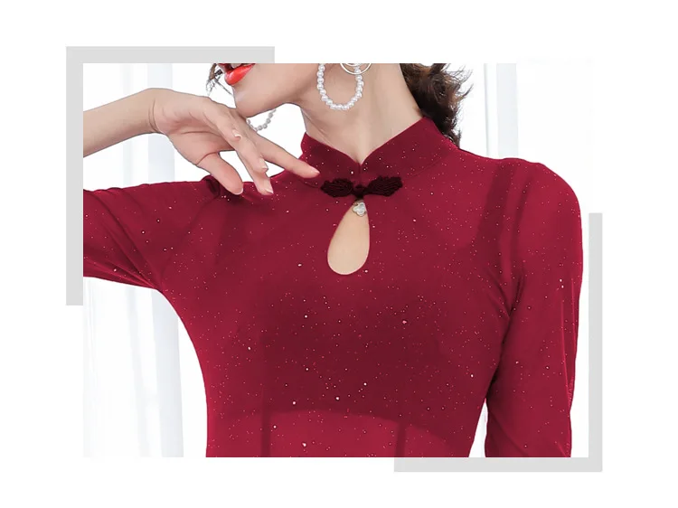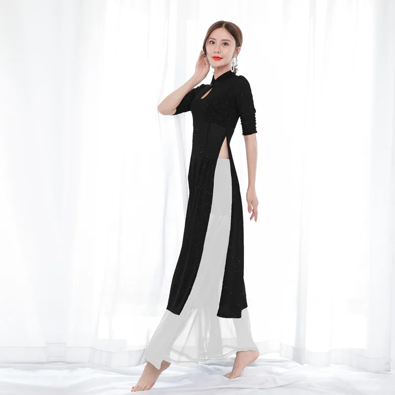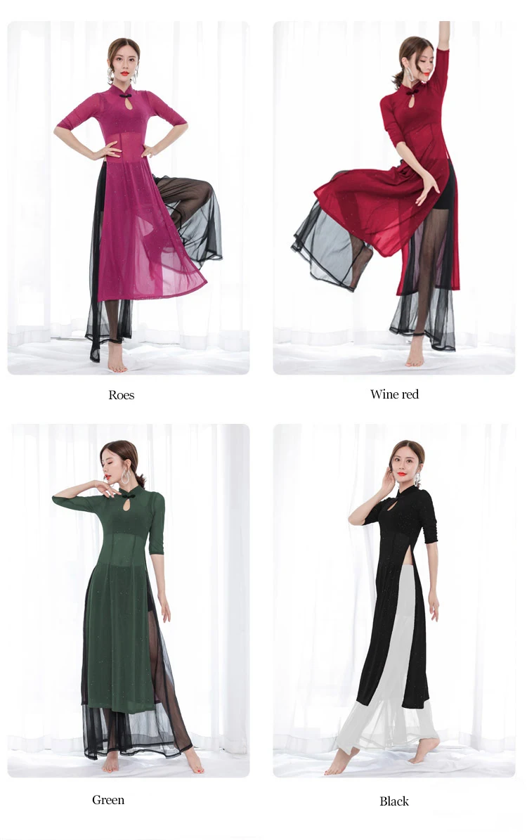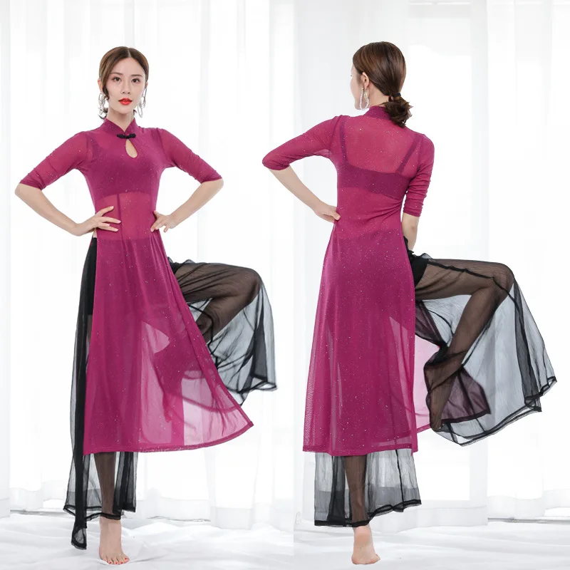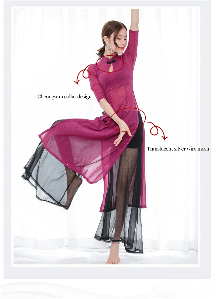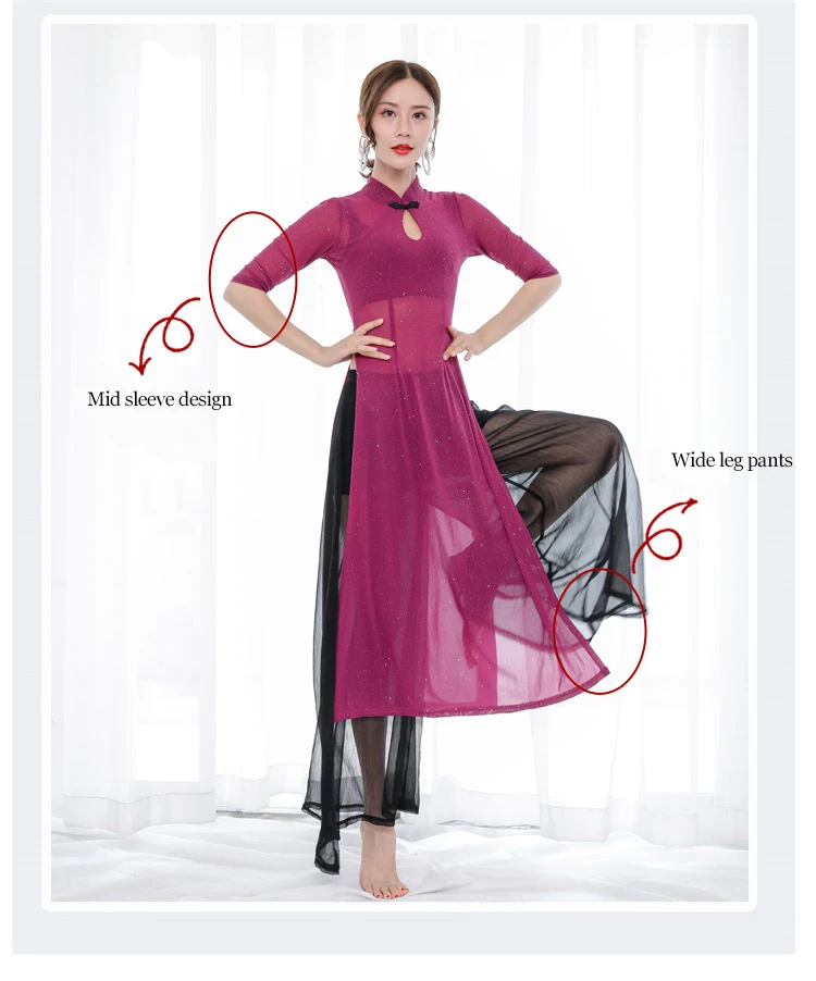 Oriental Dance Dress 2021 Modern Folk Dance Practice Dress Cheongsam Belly Dance Loose Trouser Suit Translucent Silver Wire Mesh