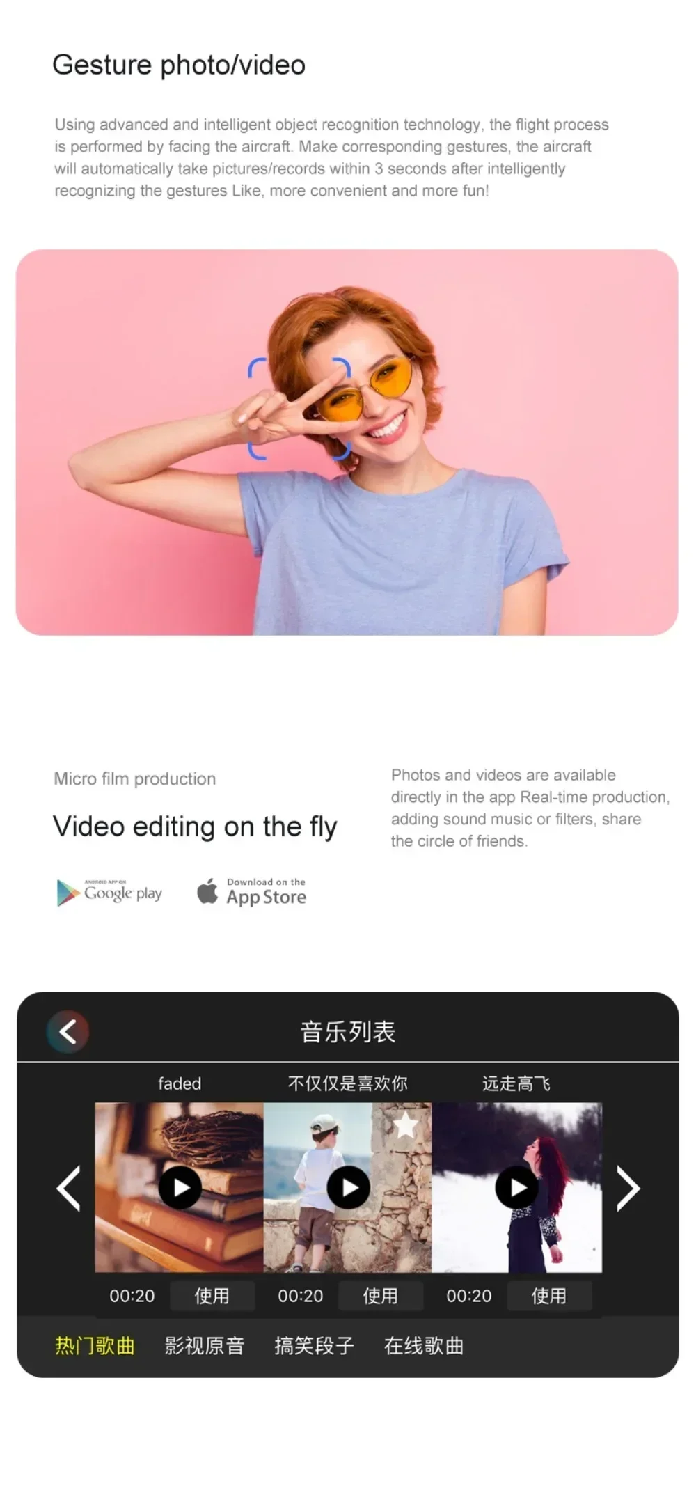 -One-touch take-off/landing. One button auto take-off or landing, the drone will automatically take off or return to the take-off position.