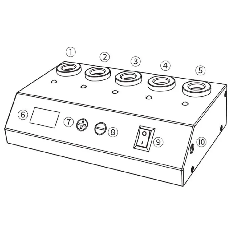 1- Standard test hole; 2-3-4-5-test hole; 6-display; 7-revolution "+"; 8-revolution "-"; 9-Power switch; 10- Power interface.