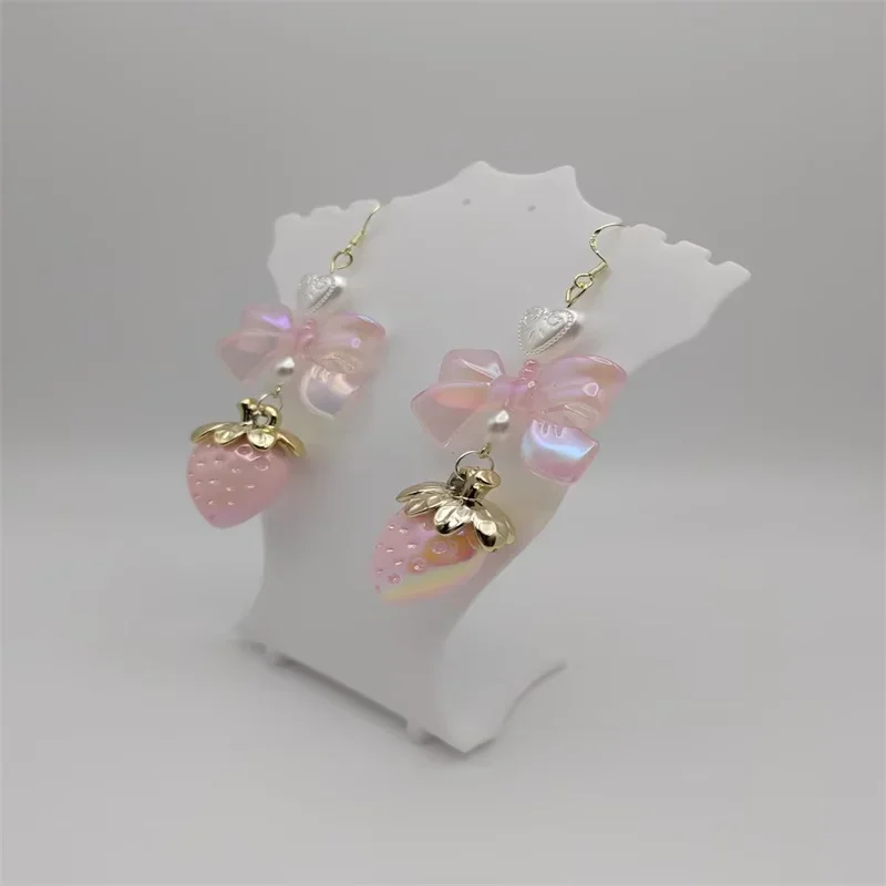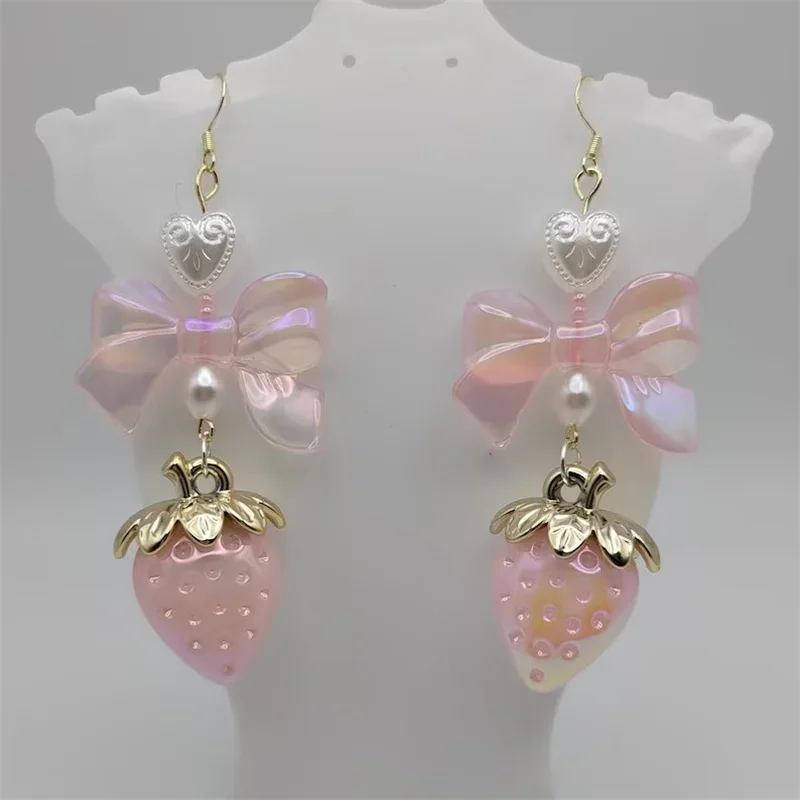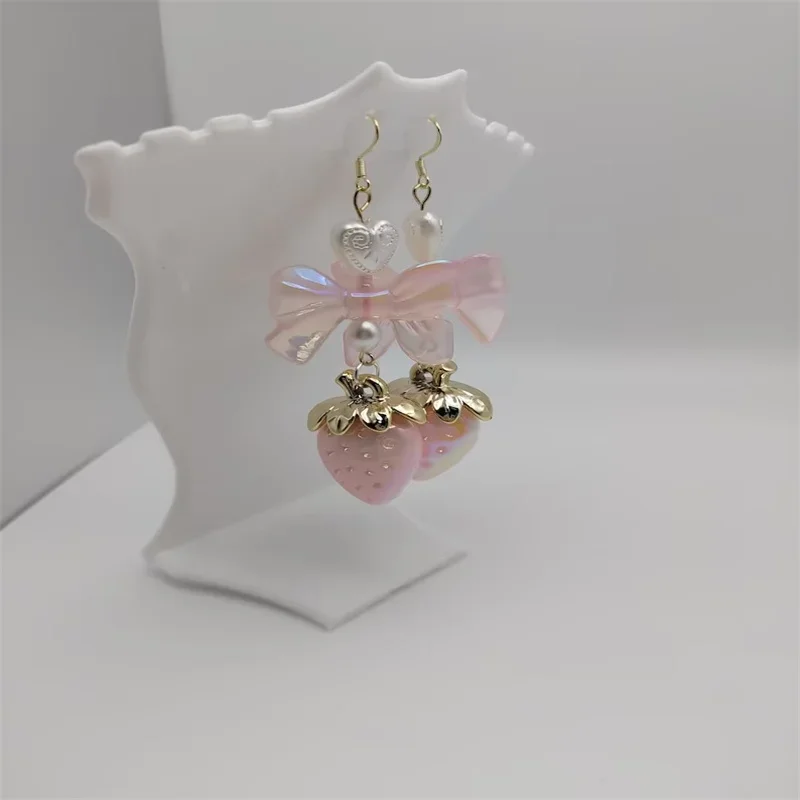 Pastel strawberry coquette cottagecore bow earrings pearl heart milky