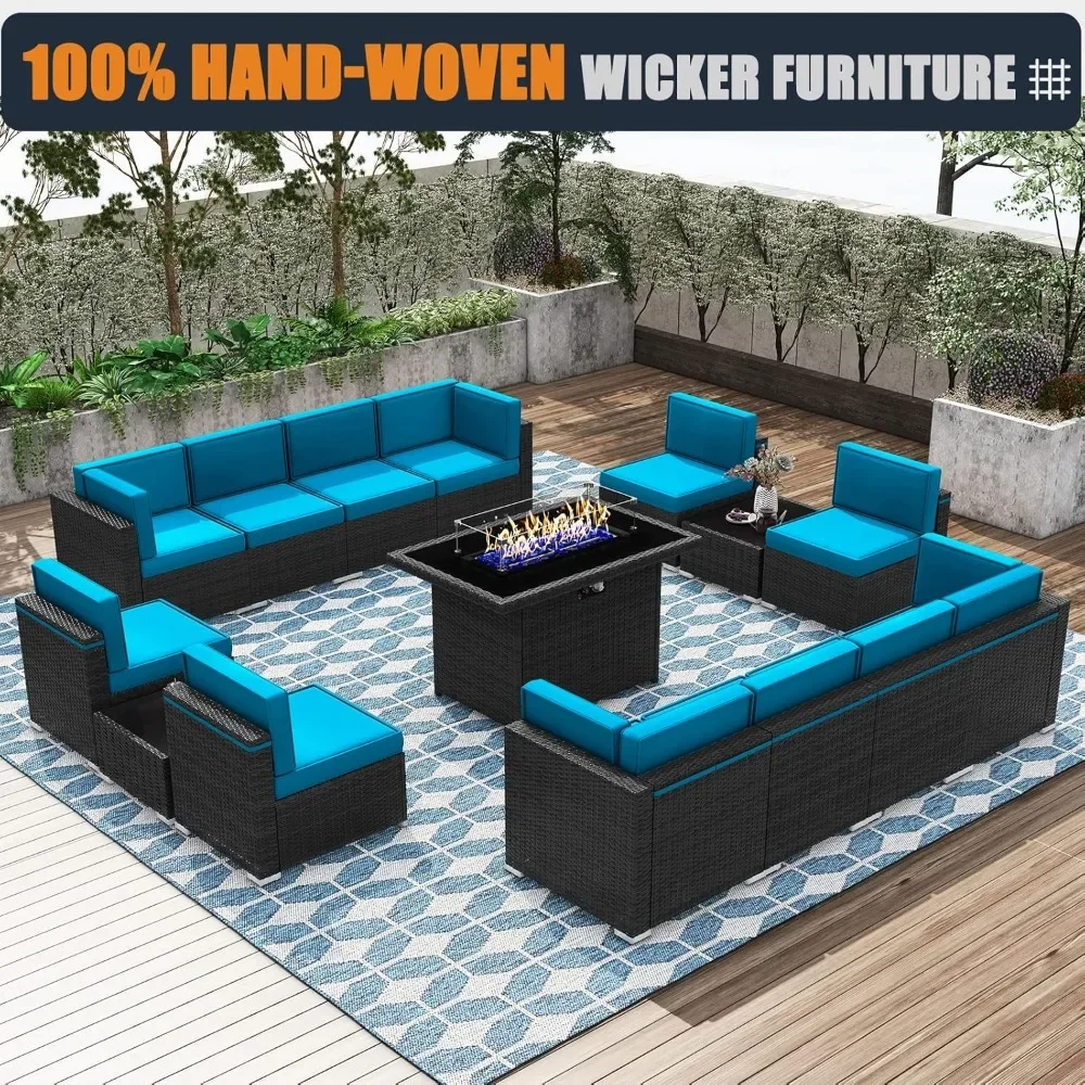 Patio Furniture Set with Fire Pit Table 15 Pieces Outdoor All-Weather Wicker Conversation Sectional Chair Sofa Set
