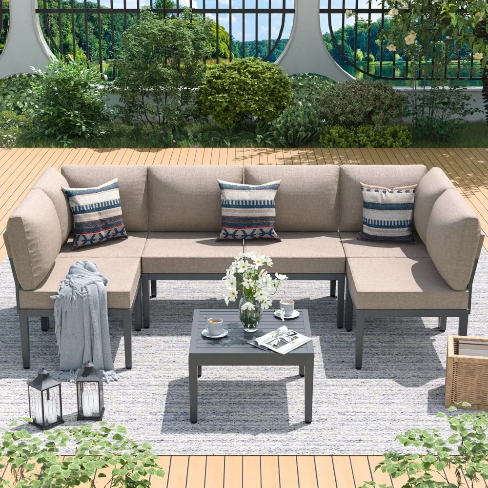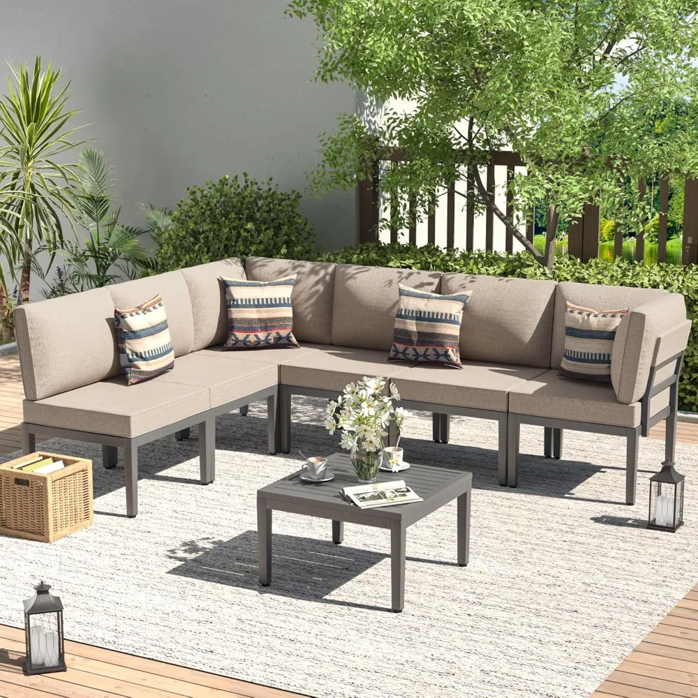 Patio Furniture Set,7 Pieces Metal Modern Outdoor Furniture,Outdoor Sectional Sofa w/5.1″ Cushions and Coffee Table for Patio
