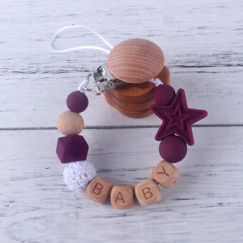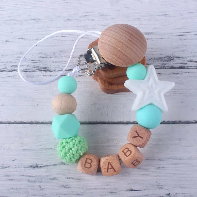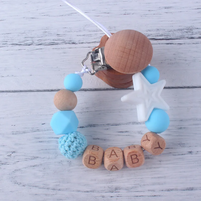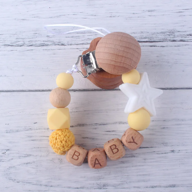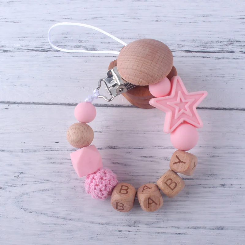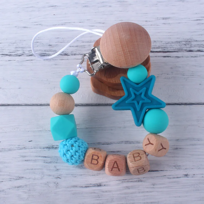 Personalized Name Beech Wood Baby Pacifier Clips Silicone Star Teether Soother Chain Infant Dummy Holder
