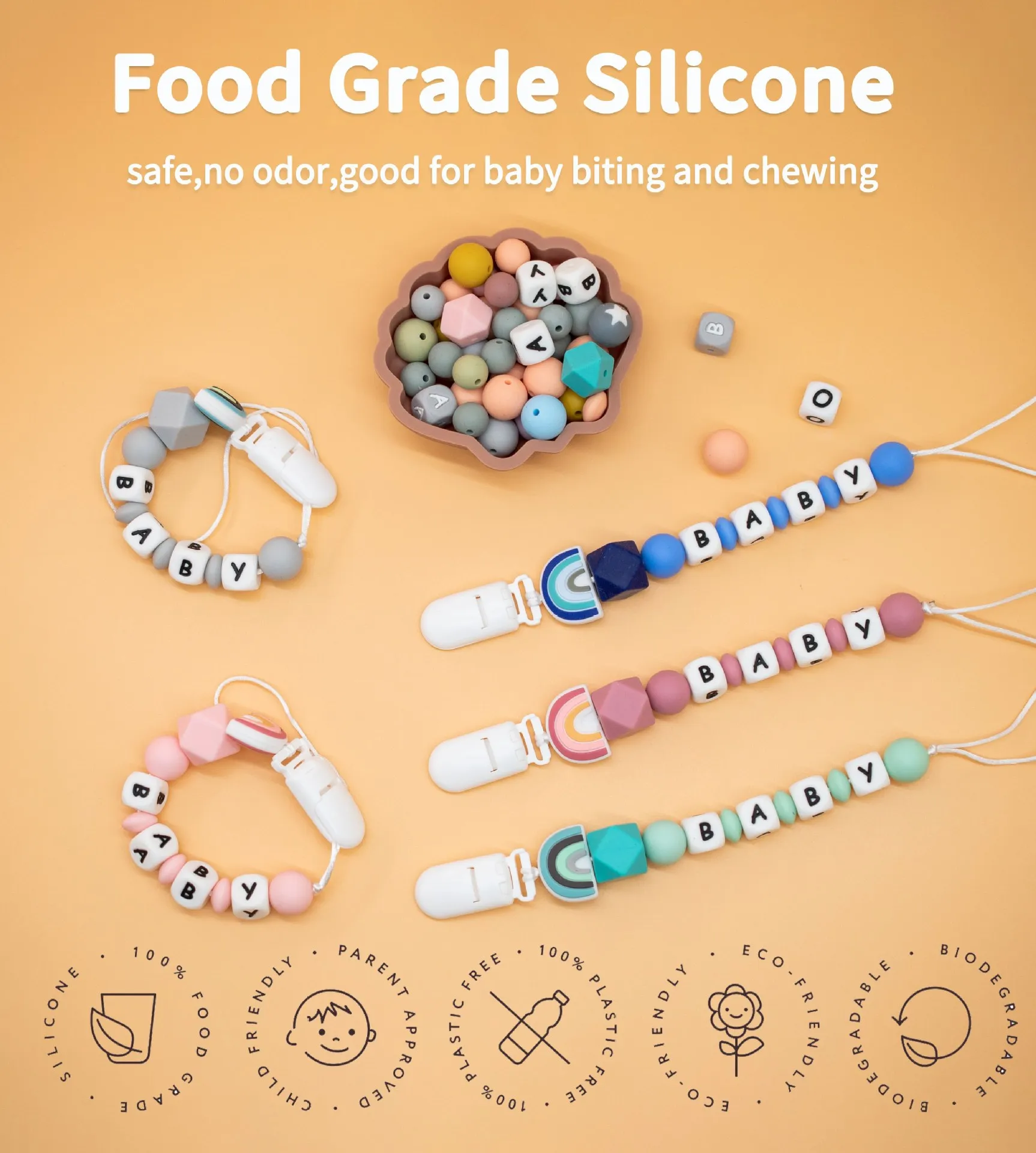Baby Customizable Personalized Name Cartoon Silicone Beads Pacifier Chain for Teether Nursing Toys Nipple Dummy Holder Chains
