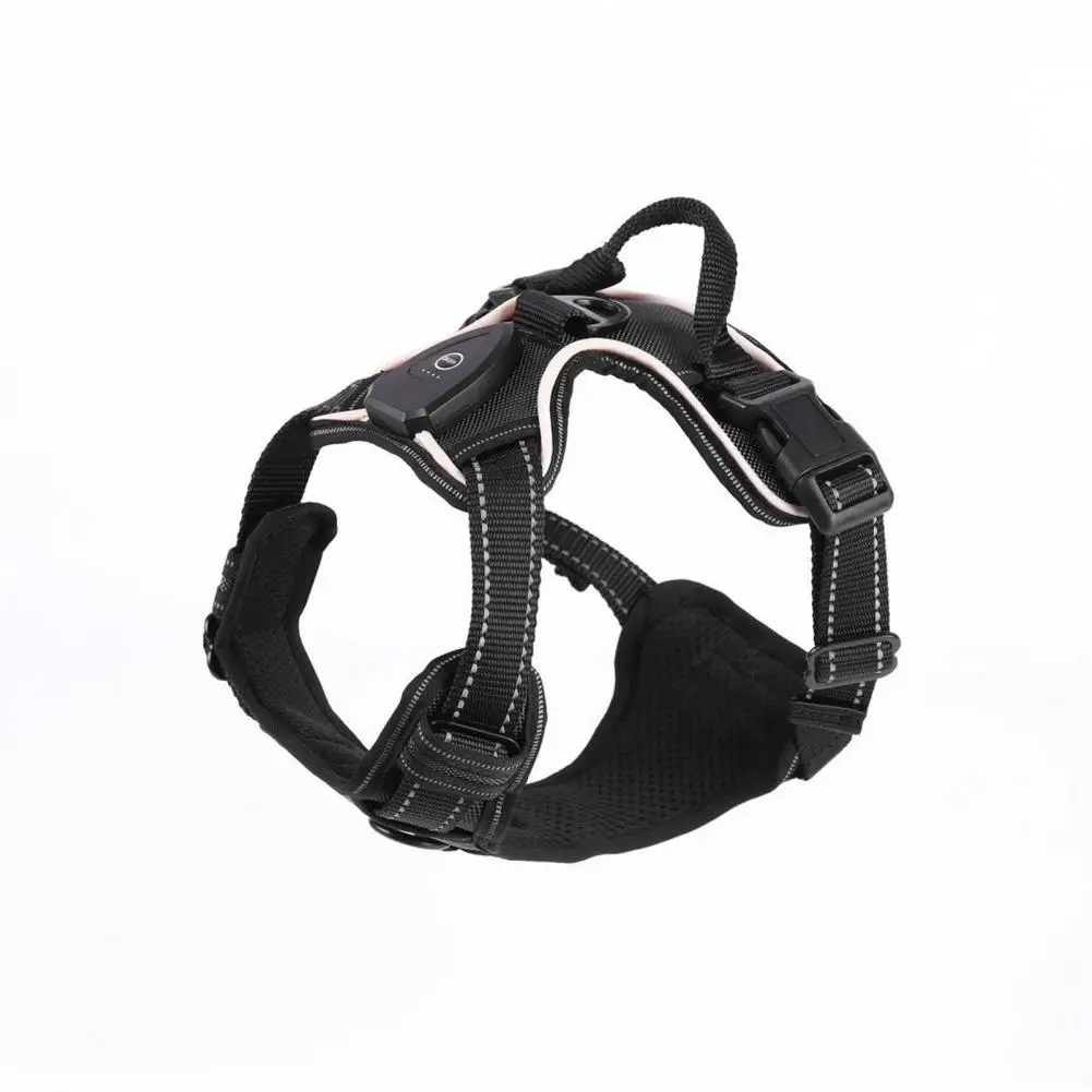 Luminous pet harness with light-up feature for nighttime visibility.