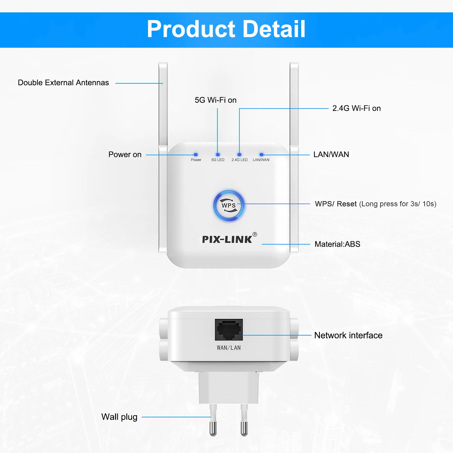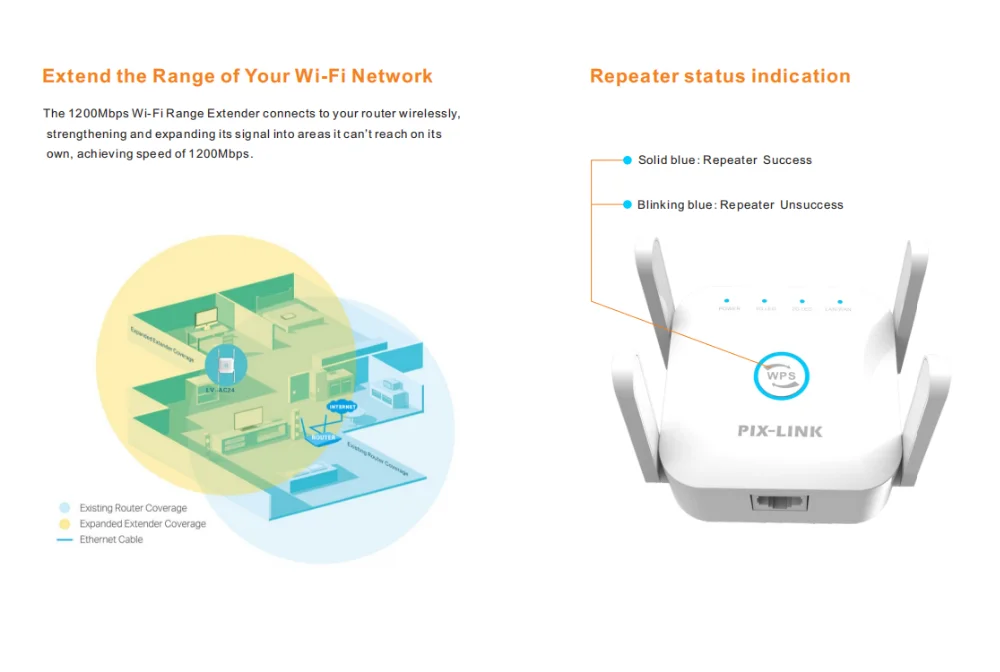 PIXLINK WiFi Range Extender can extend your existing WiFi coverage, create stronger and farther-reaching connections in areas hard to reach conveniently, allowing you enjoy fast wireless coverage throughout all your home.