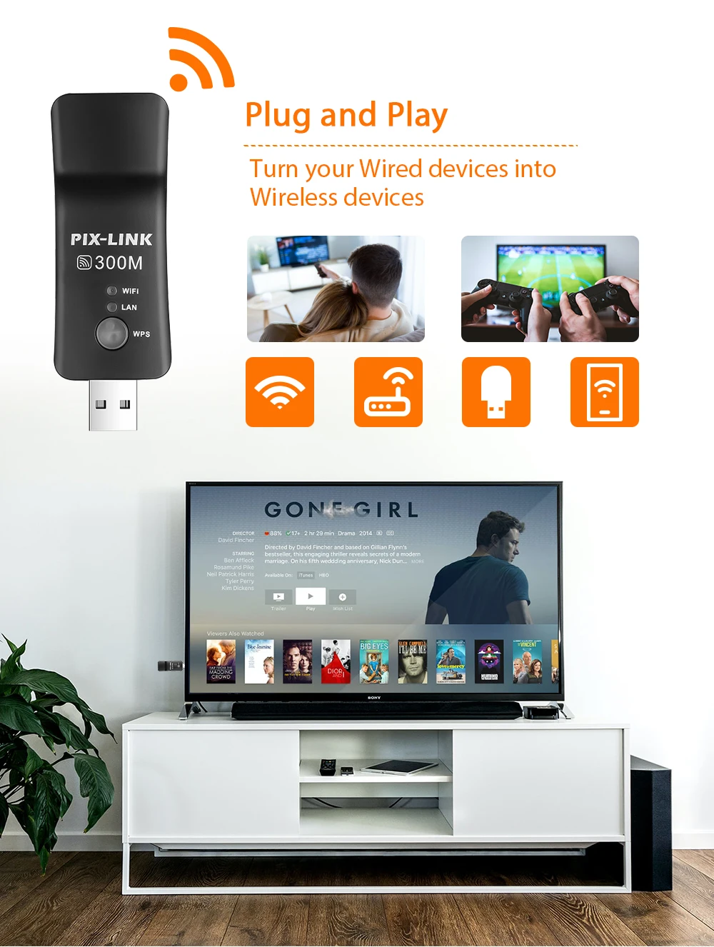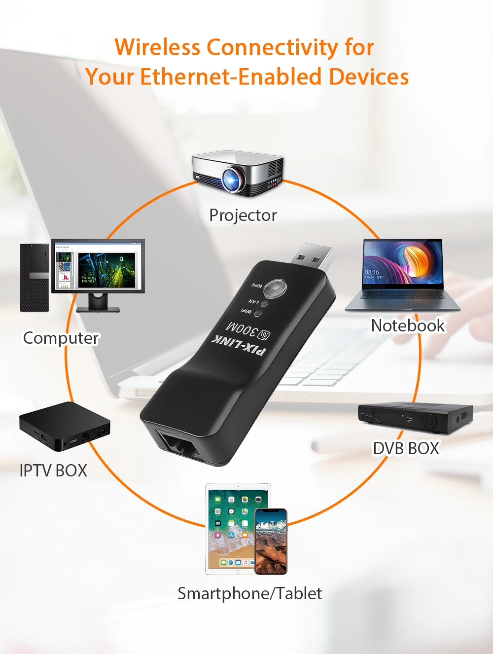 PIXLINK Wireless USB Universal 300Mbps Wifi Adapter RJ-45 Port Ethernet Network Bridge Repeater Client for New Smart TV