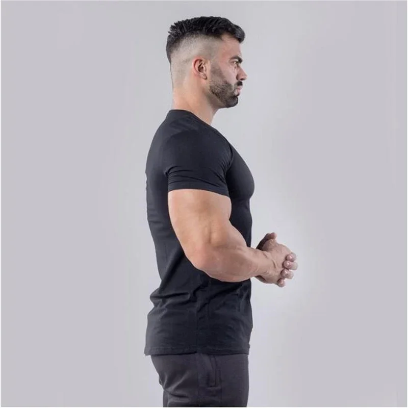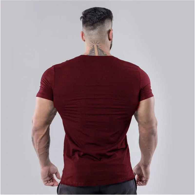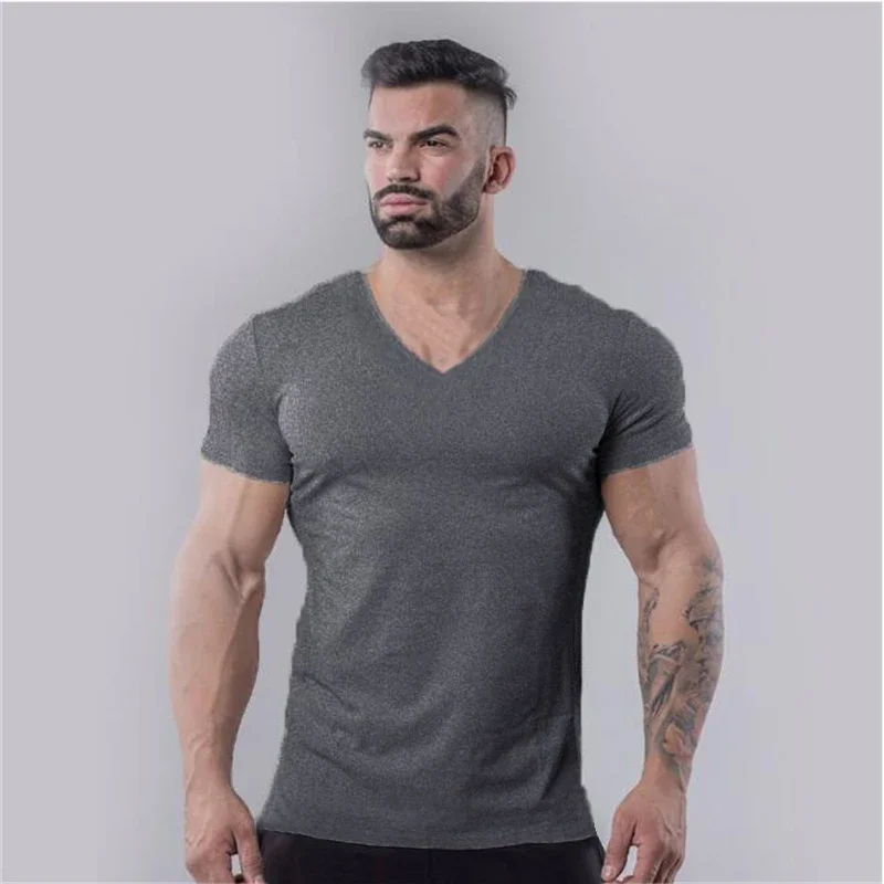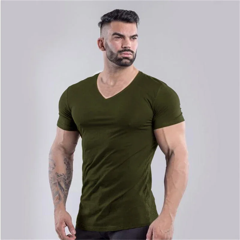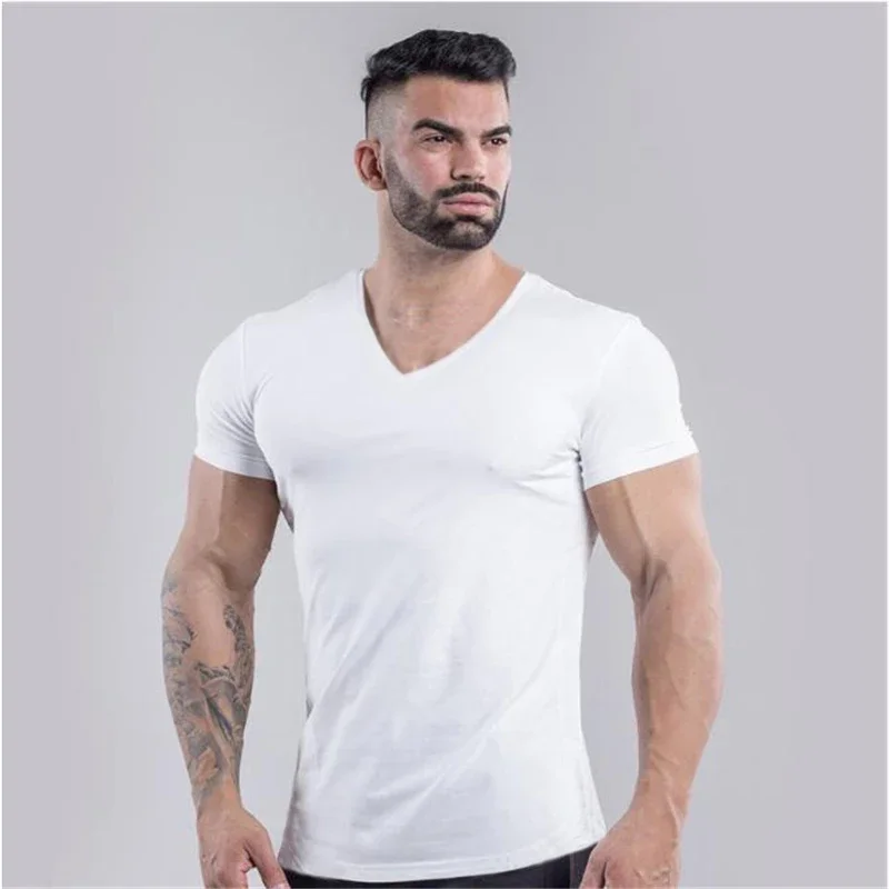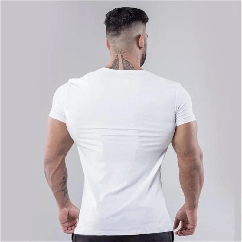 Plain Cotton Gym T-shirt Men Summer Fitness Clothing V-Neck Short Sleeve T Shirt Slim Fit Tshirt Bodybuilding Workout Tees Tops