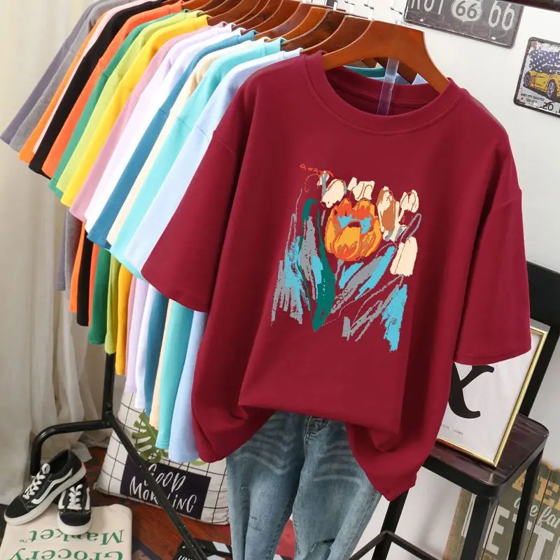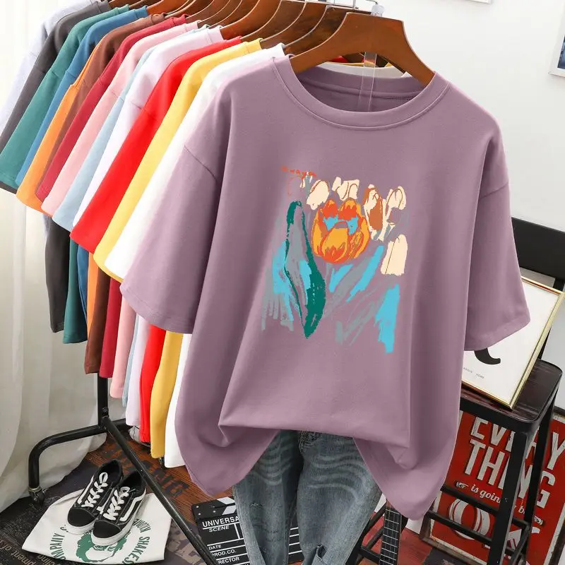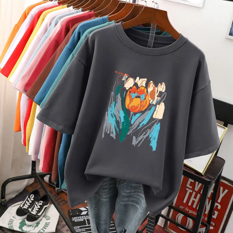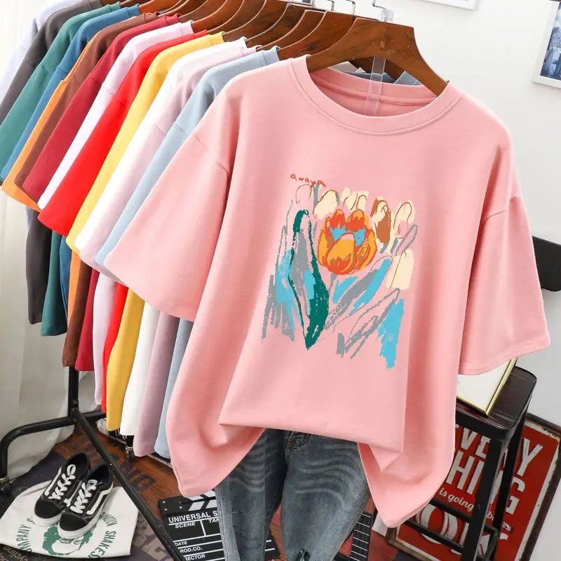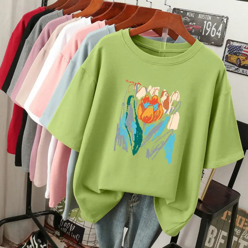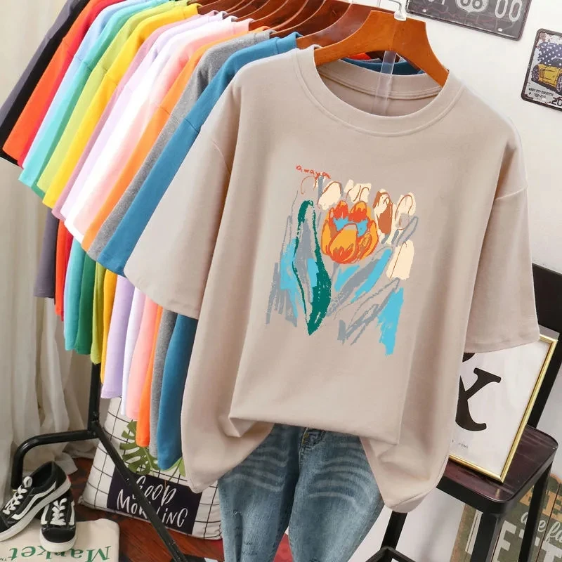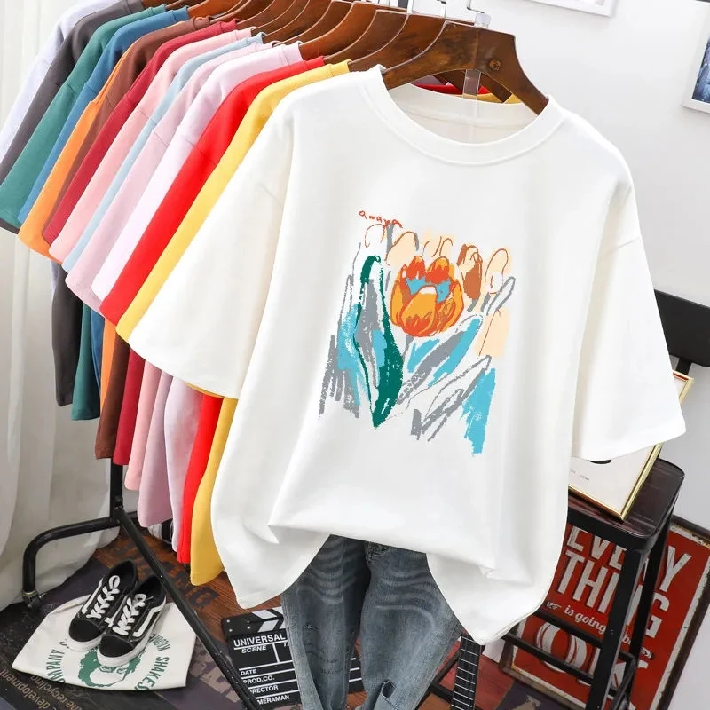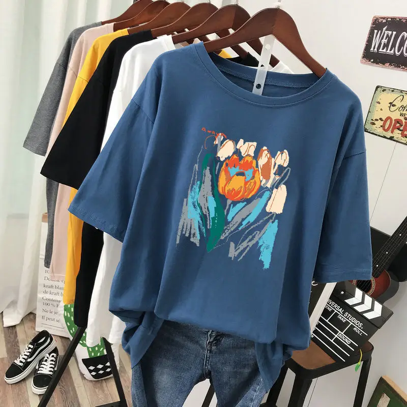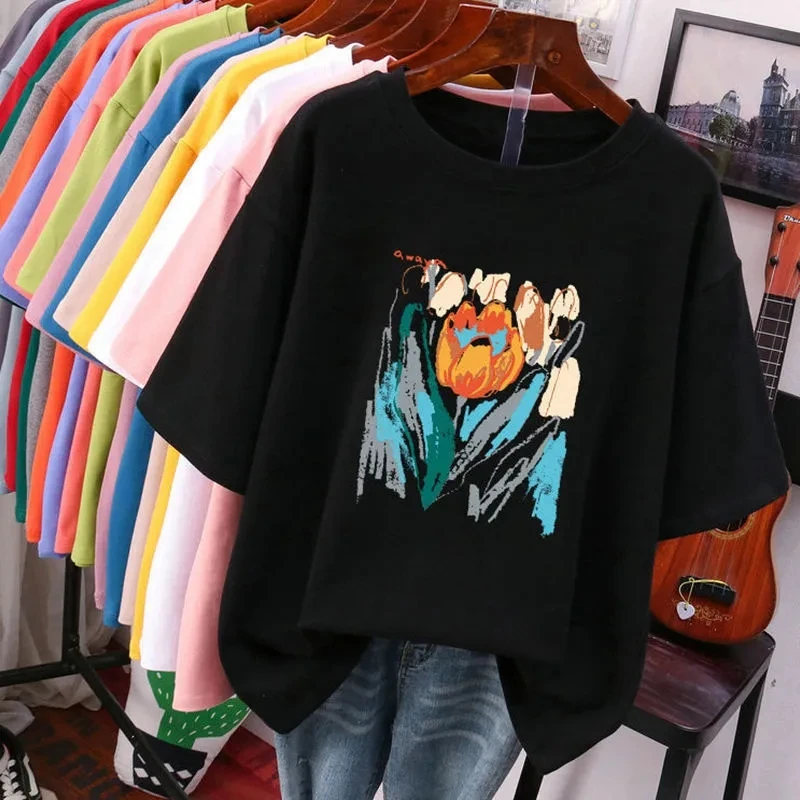 Plus Size 6XL 150KG Summer Women’s Floral Painting T shirt Black White O Neck Basic Tops Short Sleeve Flower Tees