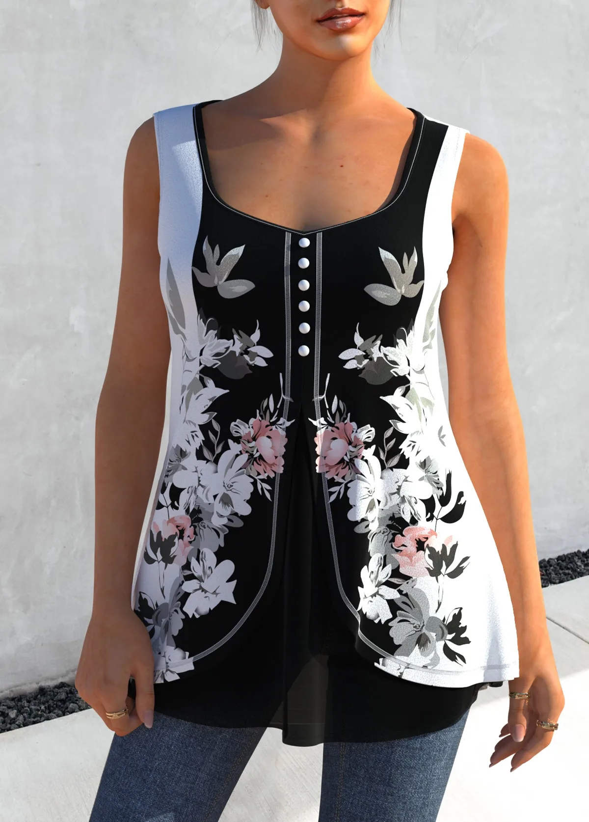 Plus Size Floral Print Decorative Button Faux Two Piece Tank Top