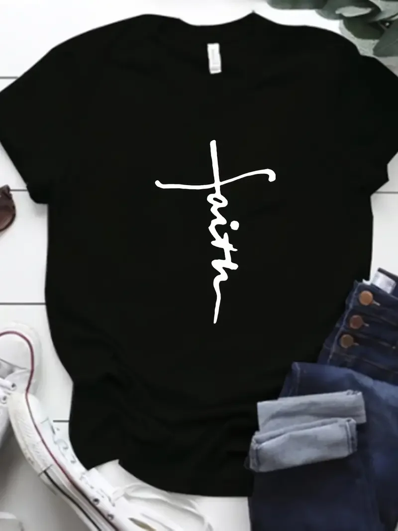 Plus Size Letter Print Short Sleeve T-shirt Women’s Plus Medium Stretch Casual Tee