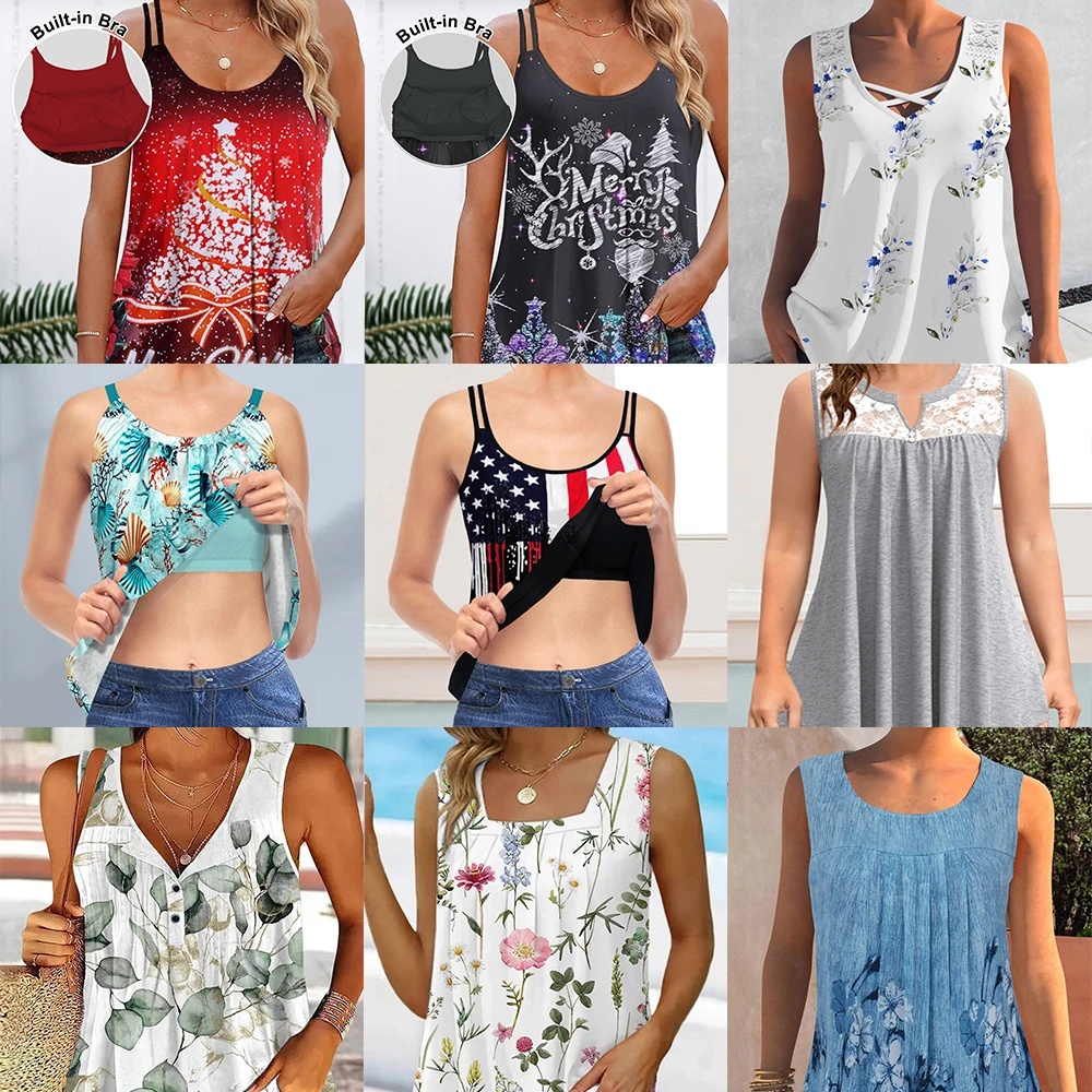 Plus size Women’s Summer Casual Camisole Sexy Vacation Print Comfortable Cool Thin Beach Sleeveless Vest V-neck Tops