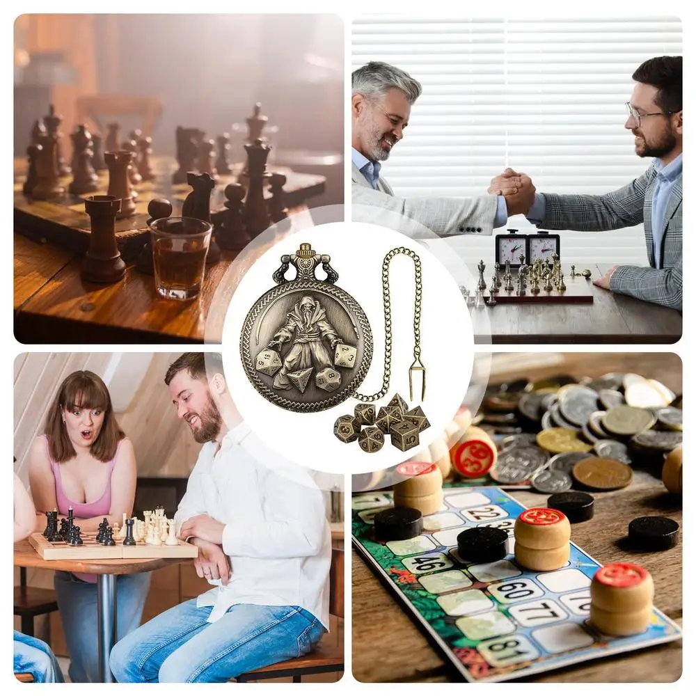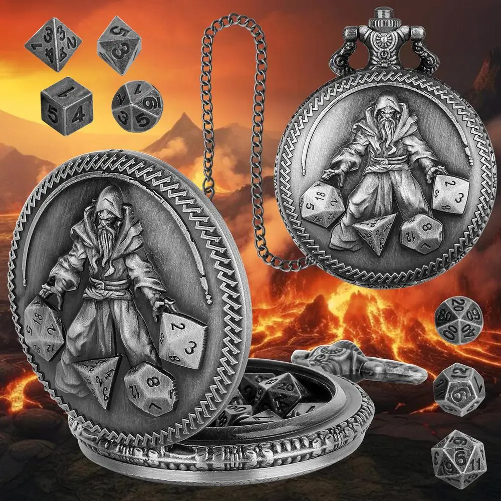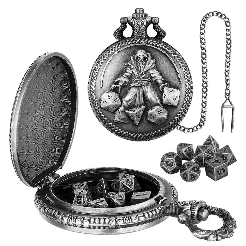 5.Adds a Touch of Vintage: Elevate your tabletop role-playing game with our pocket watch dice set. Featuring a retro steampunk design and embossed wizard pattern, it adds a unique sense of history and adventure to your game